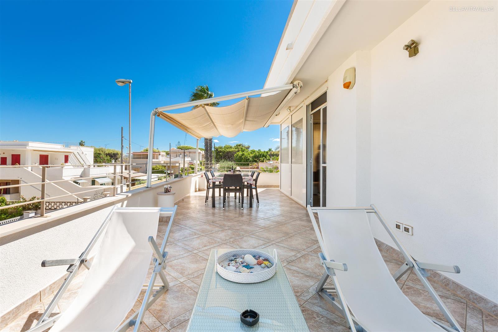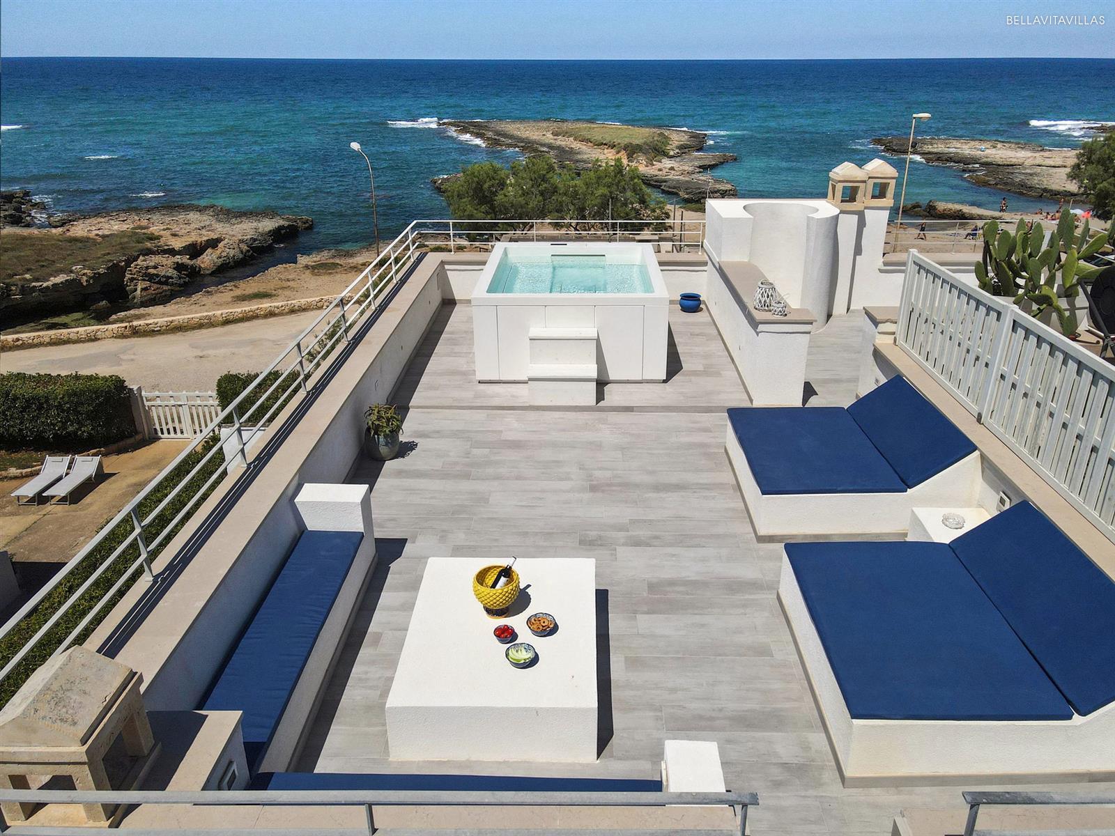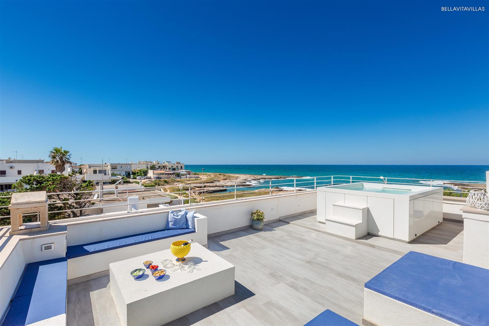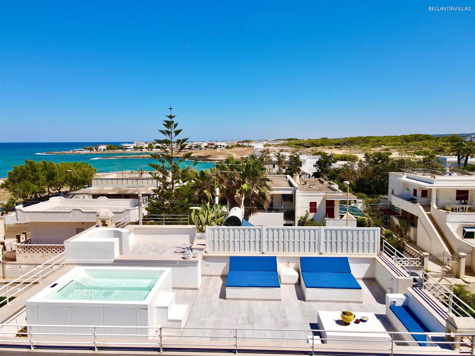 Attico Mezzaluna is a vacation apartment with Jacuzzi on a sea-view terrace in Torre Santa Sabina, marina of Carovigno. The vacation home less than 100 meters from the small beaches, offers up to 7 beds and is located on the second floor, with double terrace overlooking the sea.