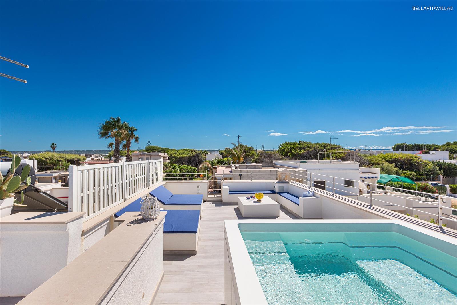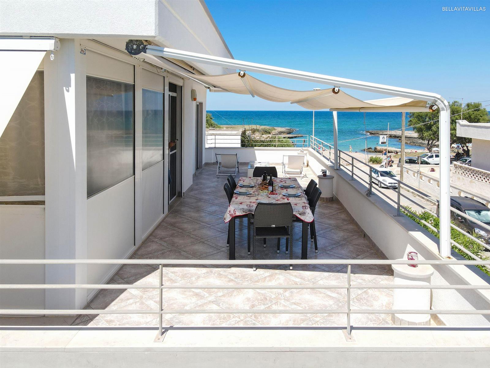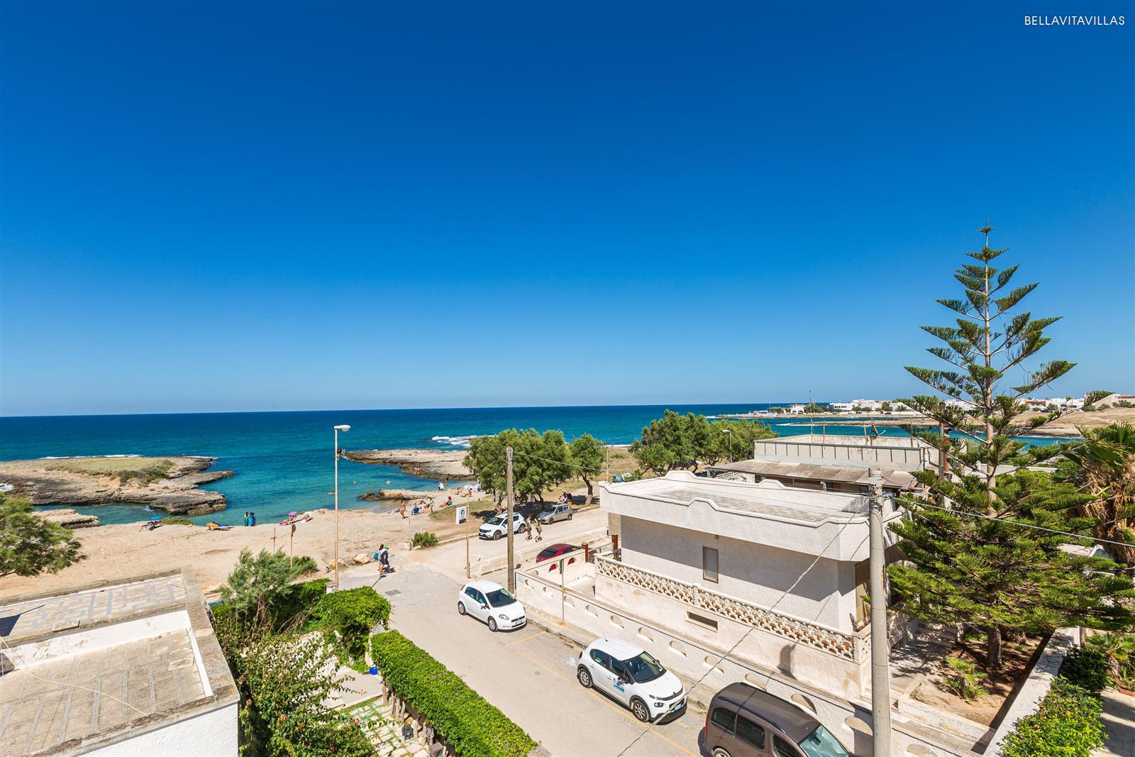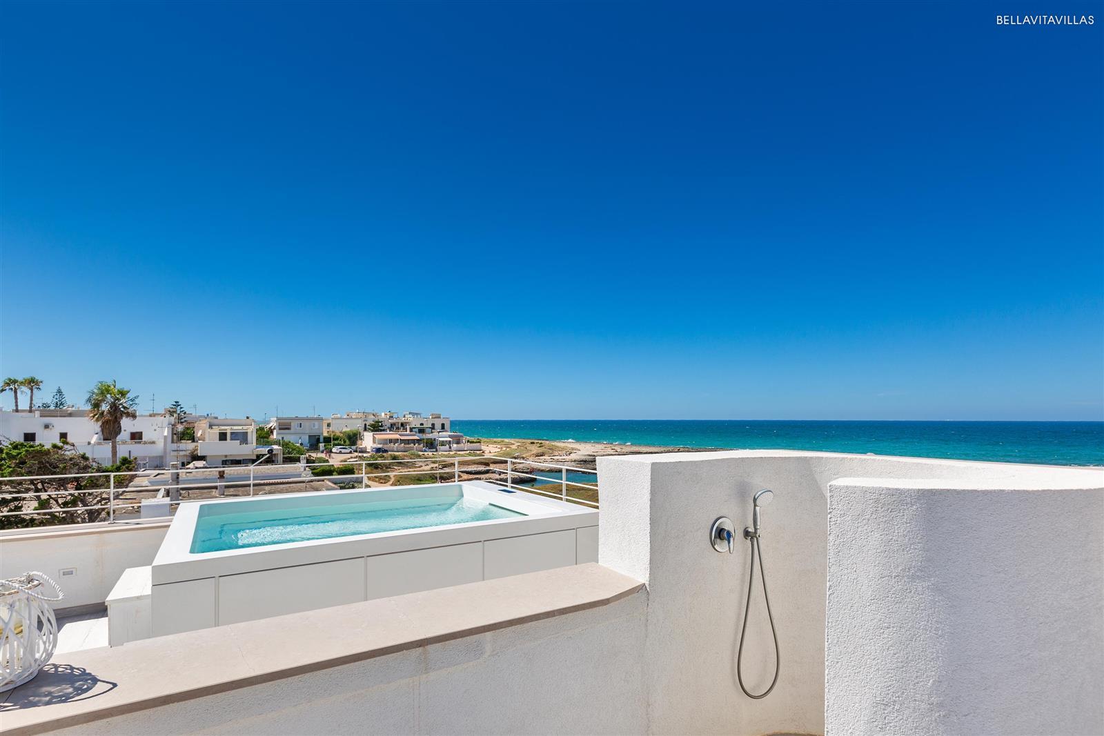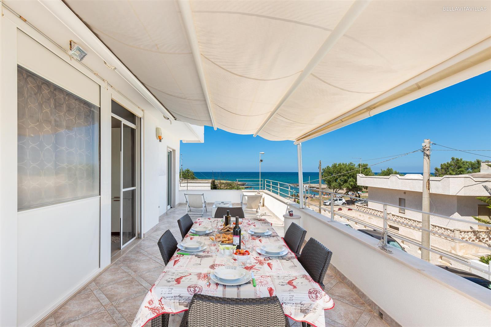 Attico Mezzaluna is a vacation apartment with Jacuzzi on a sea-view terrace in Torre Santa Sabina, marina of Carovigno. The vacation home less than 100 meters from the small beaches, offers up to 7 beds and is located on the second floor, with double terrace overlooking the sea.