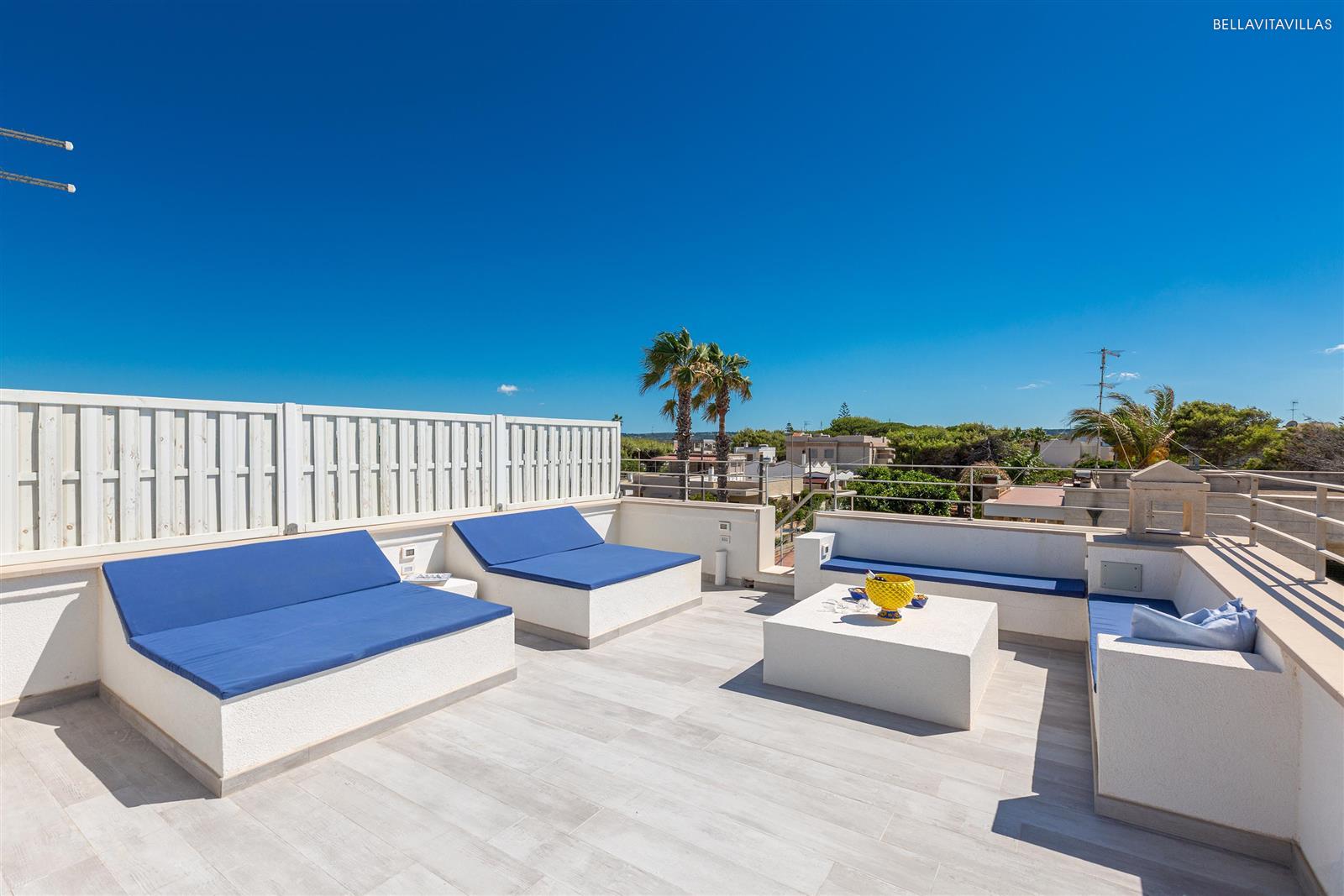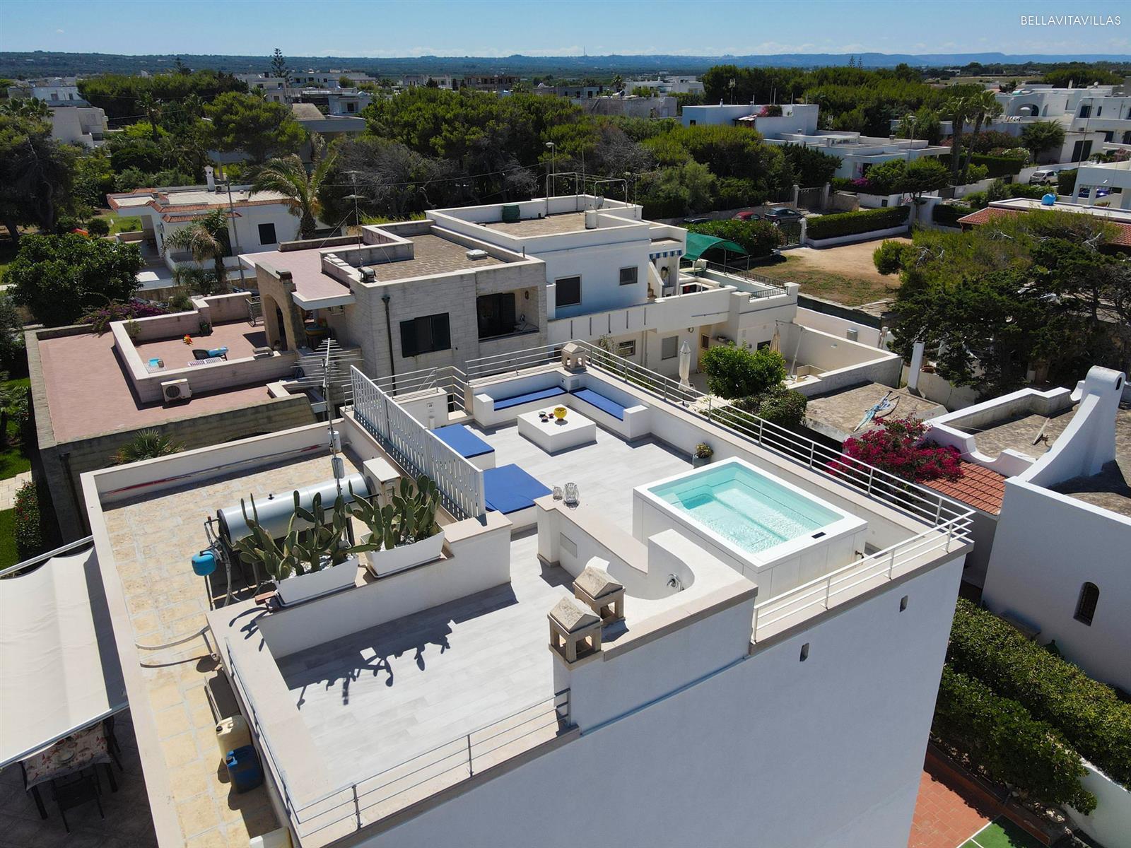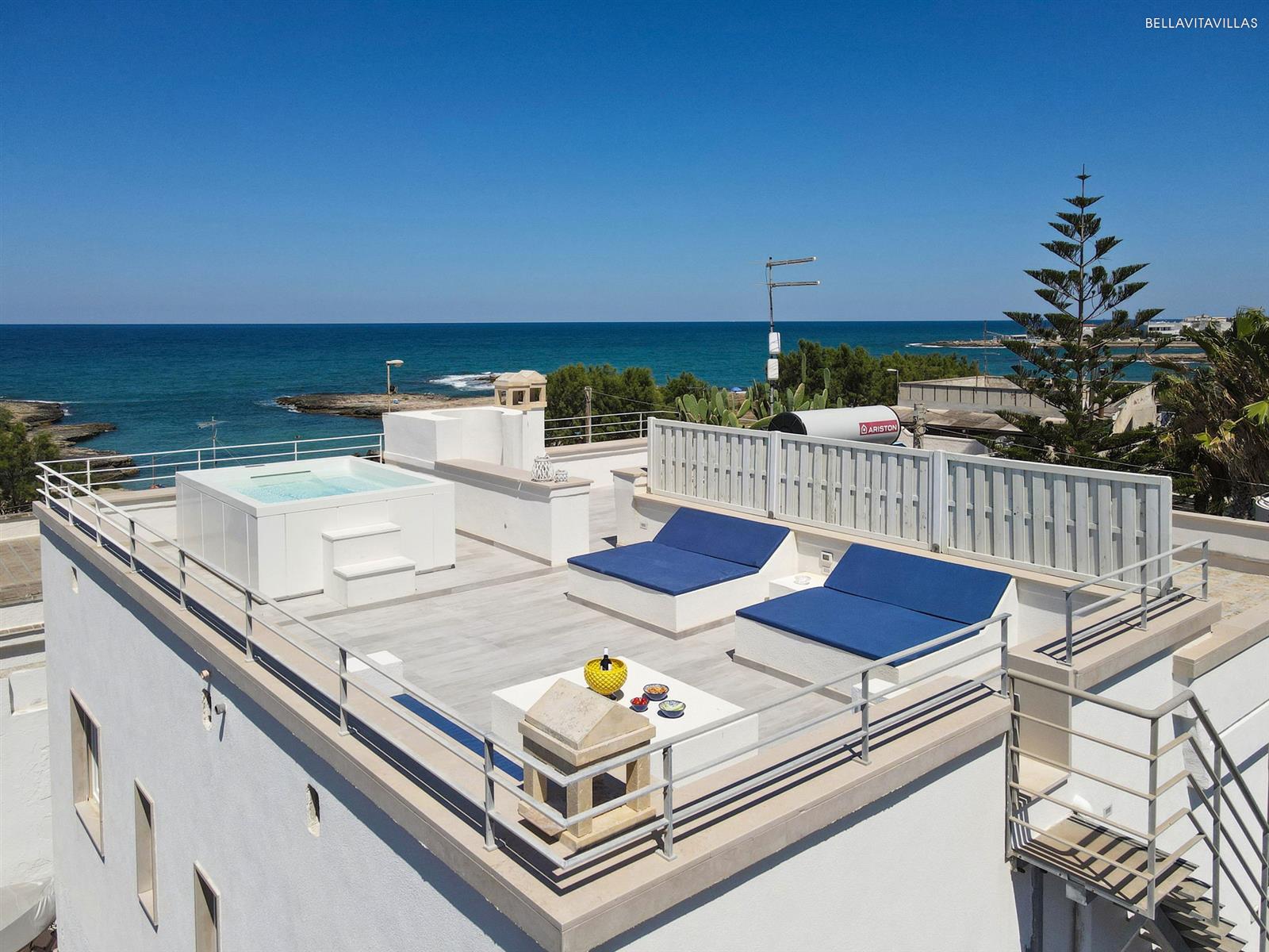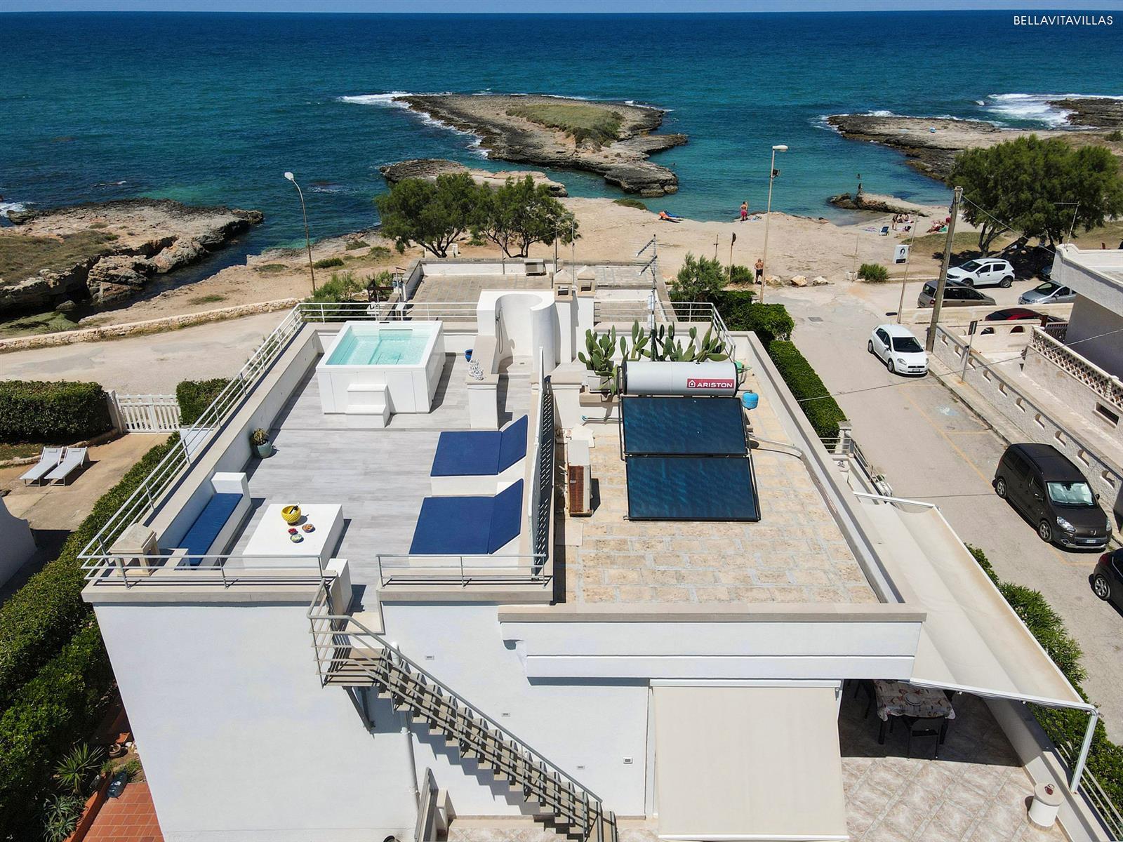 On the floor of the house there is the first large shaded terrace furnished with table and chairs where you can have lunch and dinner outside, with sea view. On the upper floor is the terrace with solarium, shower and Jacuzzi, from which there is a 360-degree view of the exceptional sea panorama.