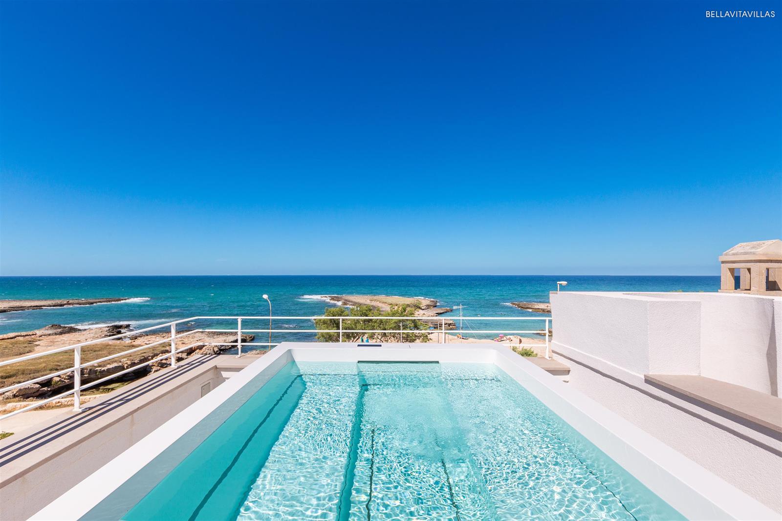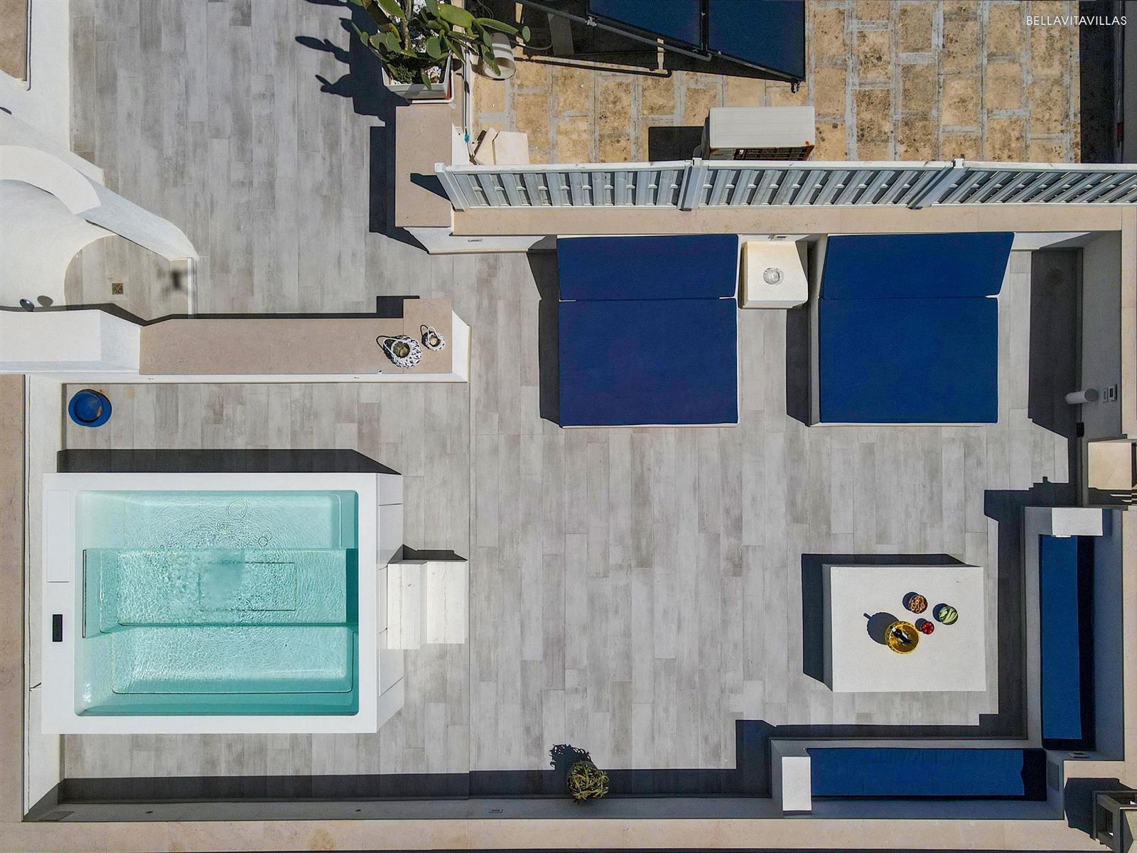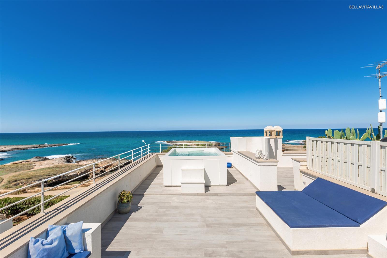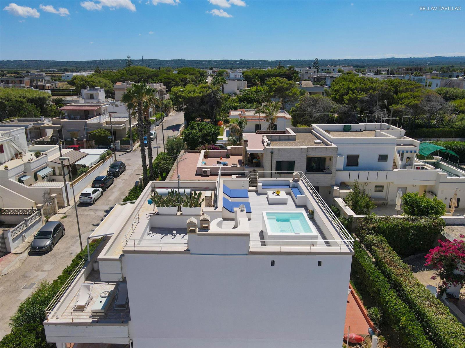 On the floor of the house there is the first large shaded terrace furnished with table and chairs where you can have lunch and dinner outside, with sea view. On the upper floor is the terrace with solarium, shower and Jacuzzi, from which there is a 360-degree view of the exceptional sea panorama.