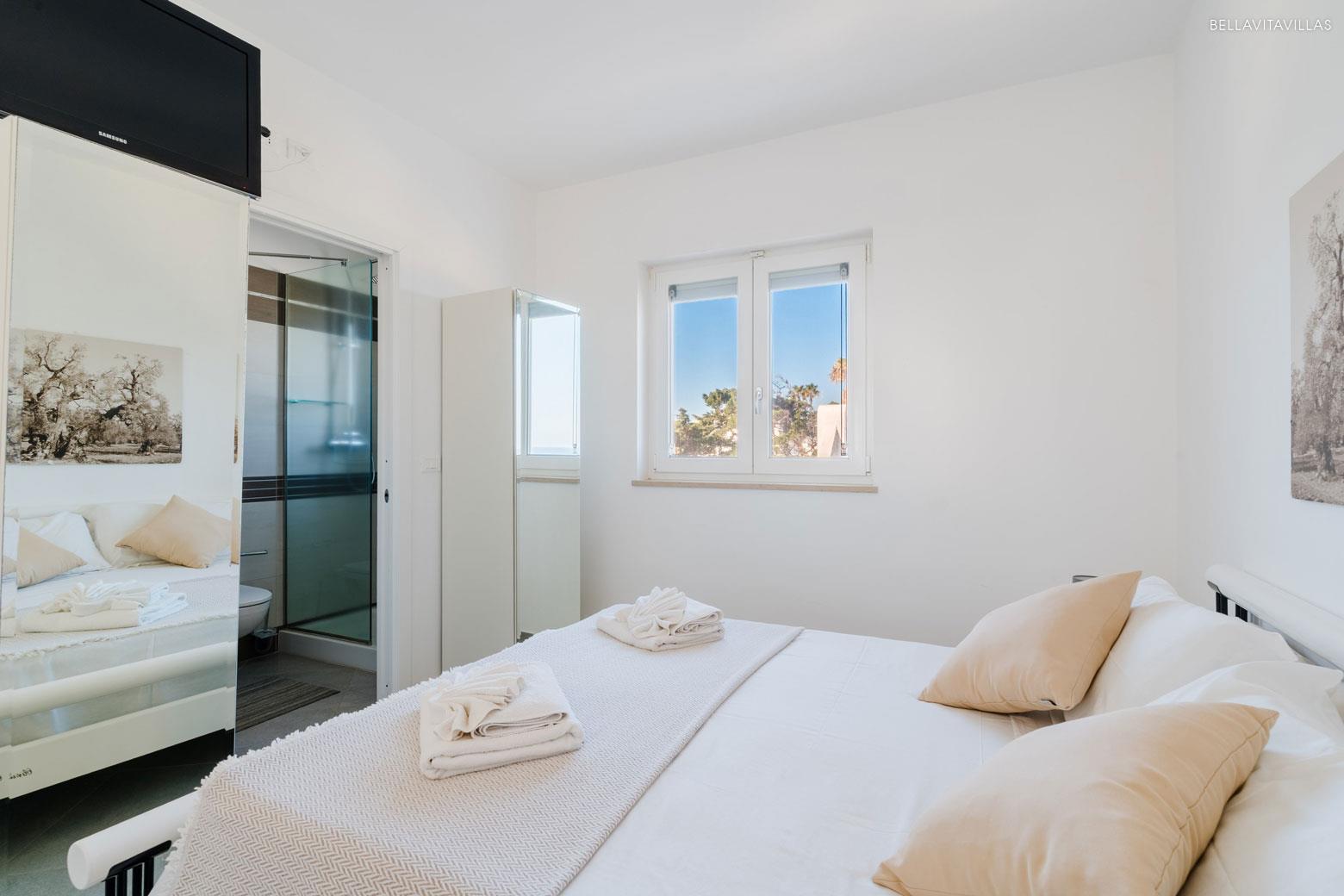 The entrance to Attico Mezzaluna is into a large hallway from which one enters the various rooms of the house, all of which are air-conditioned. There is a well-equipped kitchen, furnished with a sofa and table and chairs, 3 bedrooms all with sea view of which one is double, one double with en suite bathroom, one triple with single beds. Completing the interior is the second shower room.