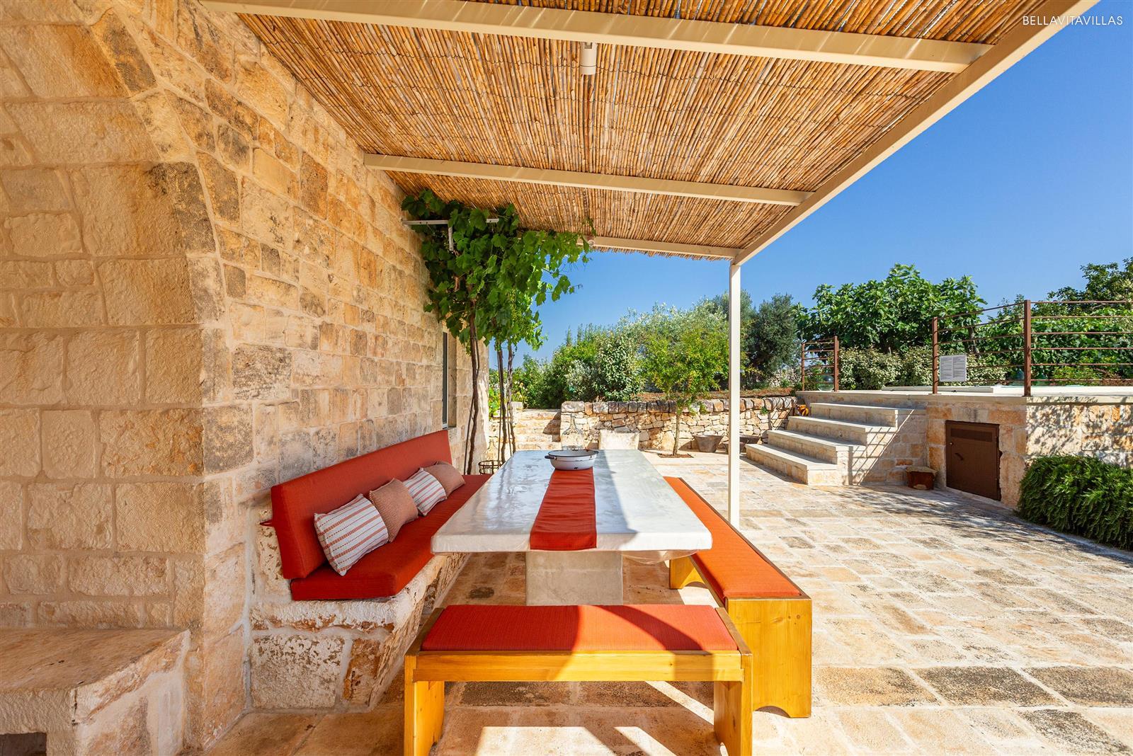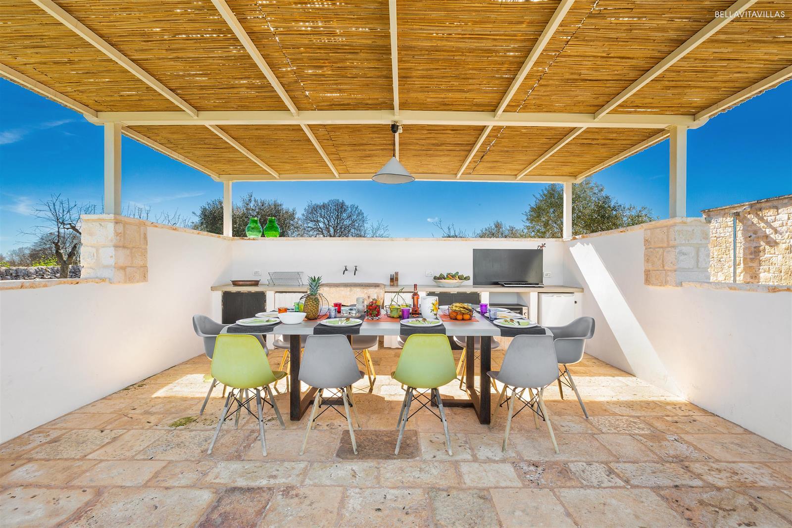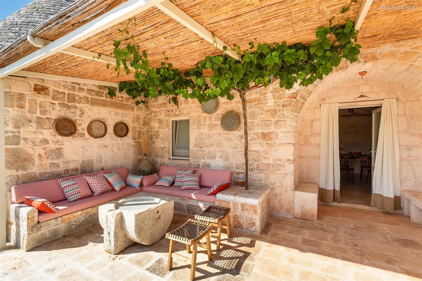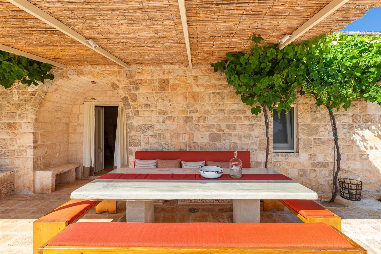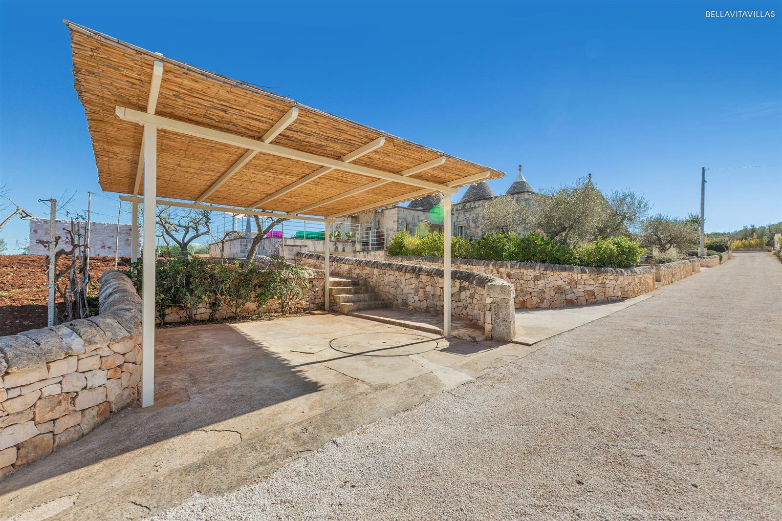 Also on the part in front of the trulli is a veranda, to take advantage of more shelter from the sun or wind and the brick barbecue area and wood-burning oven.