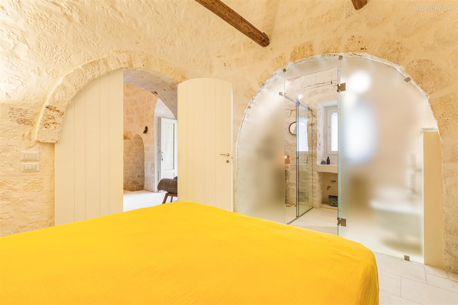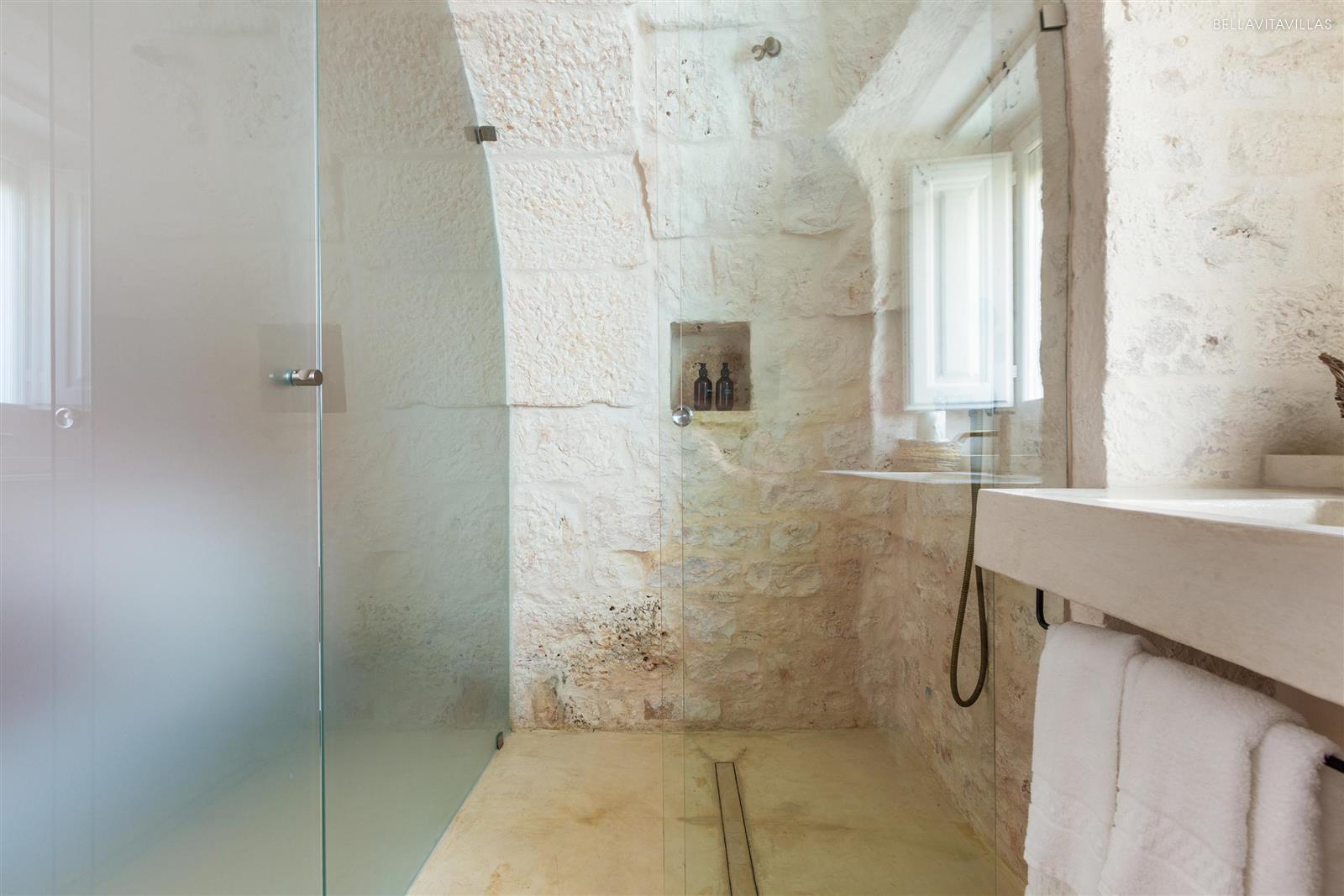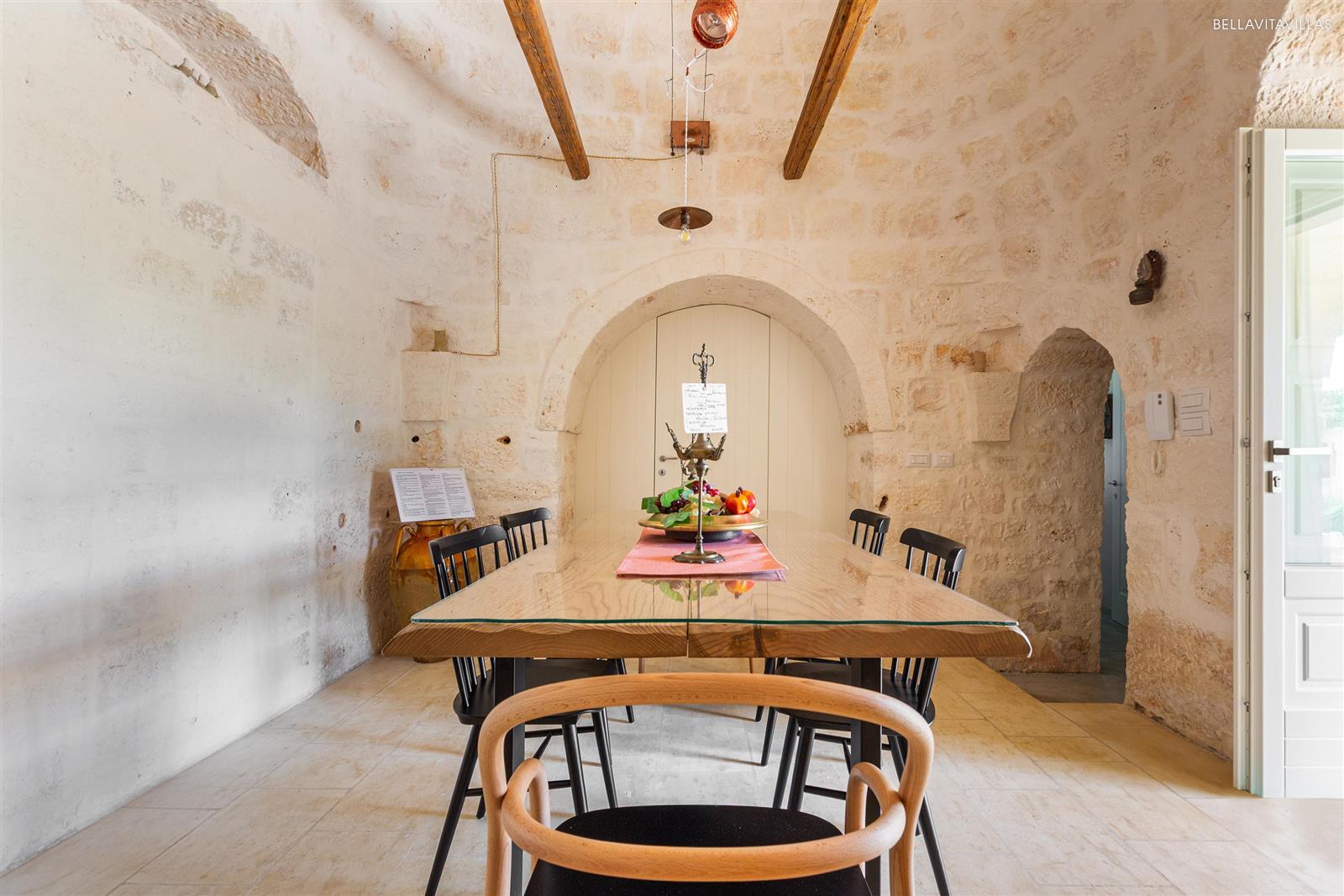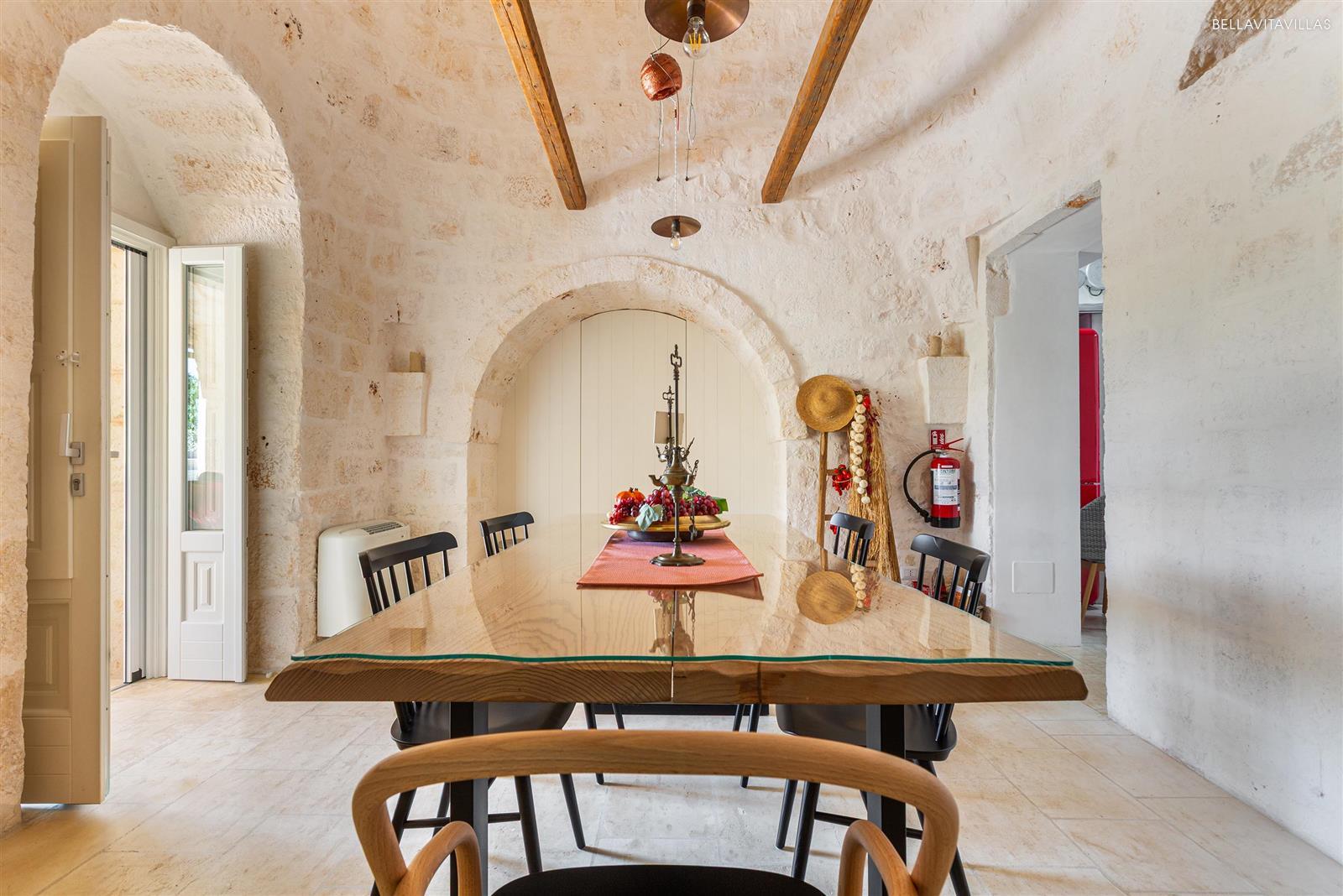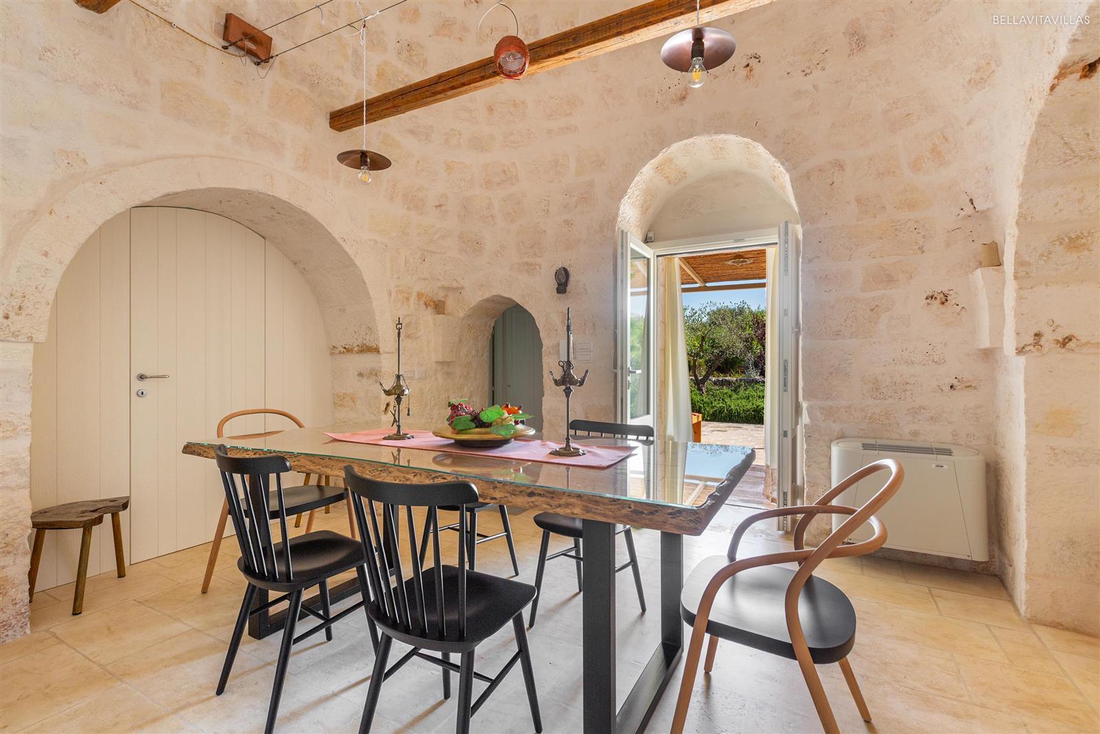 Labitazione has an entrance to a comfortable trullo dining room. Next to it is the modern, well-equipped kitchen and 4 double bedrooms, three of which have en suite shower rooms and one with an adjoining bathroom of its own.