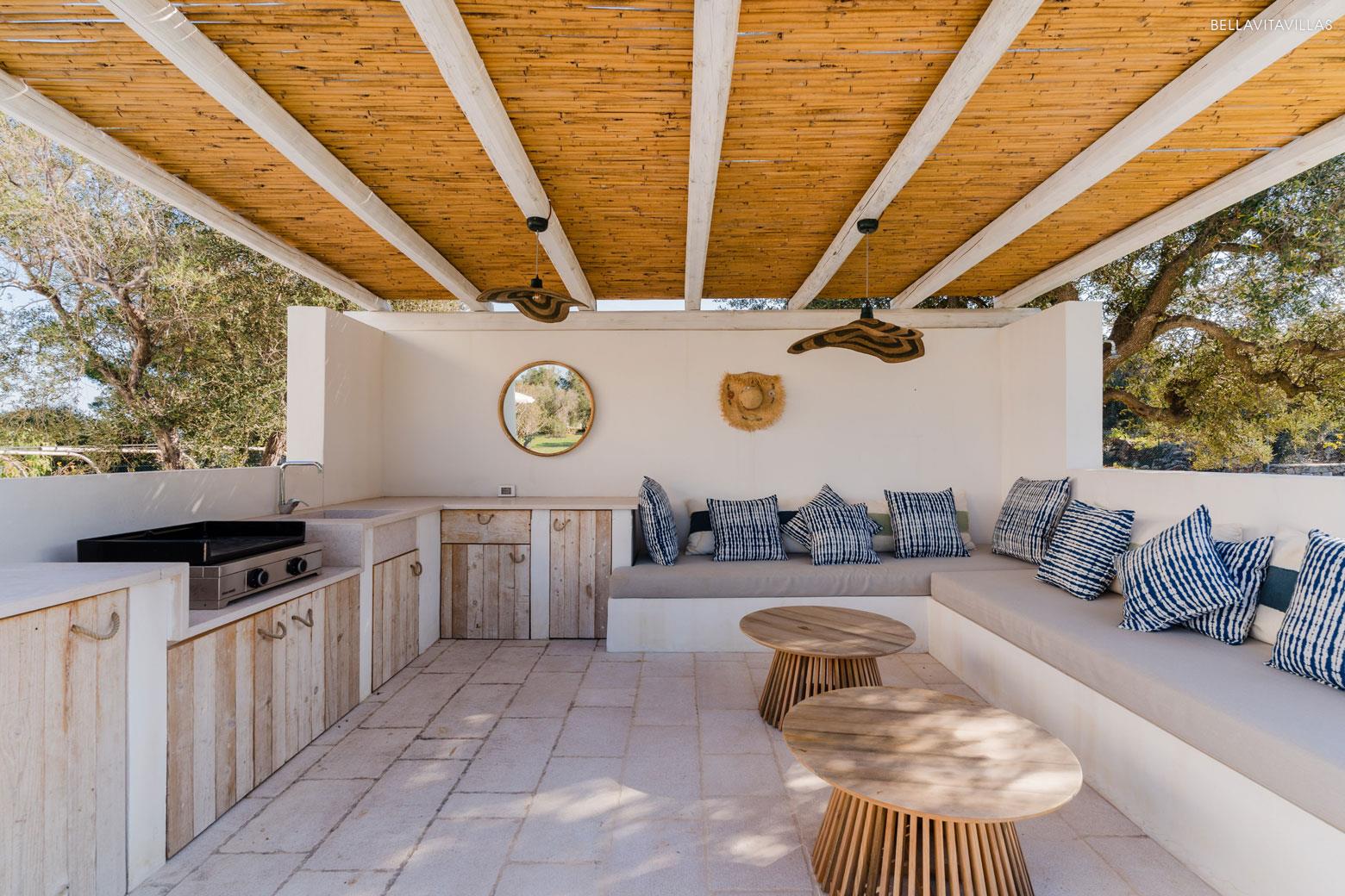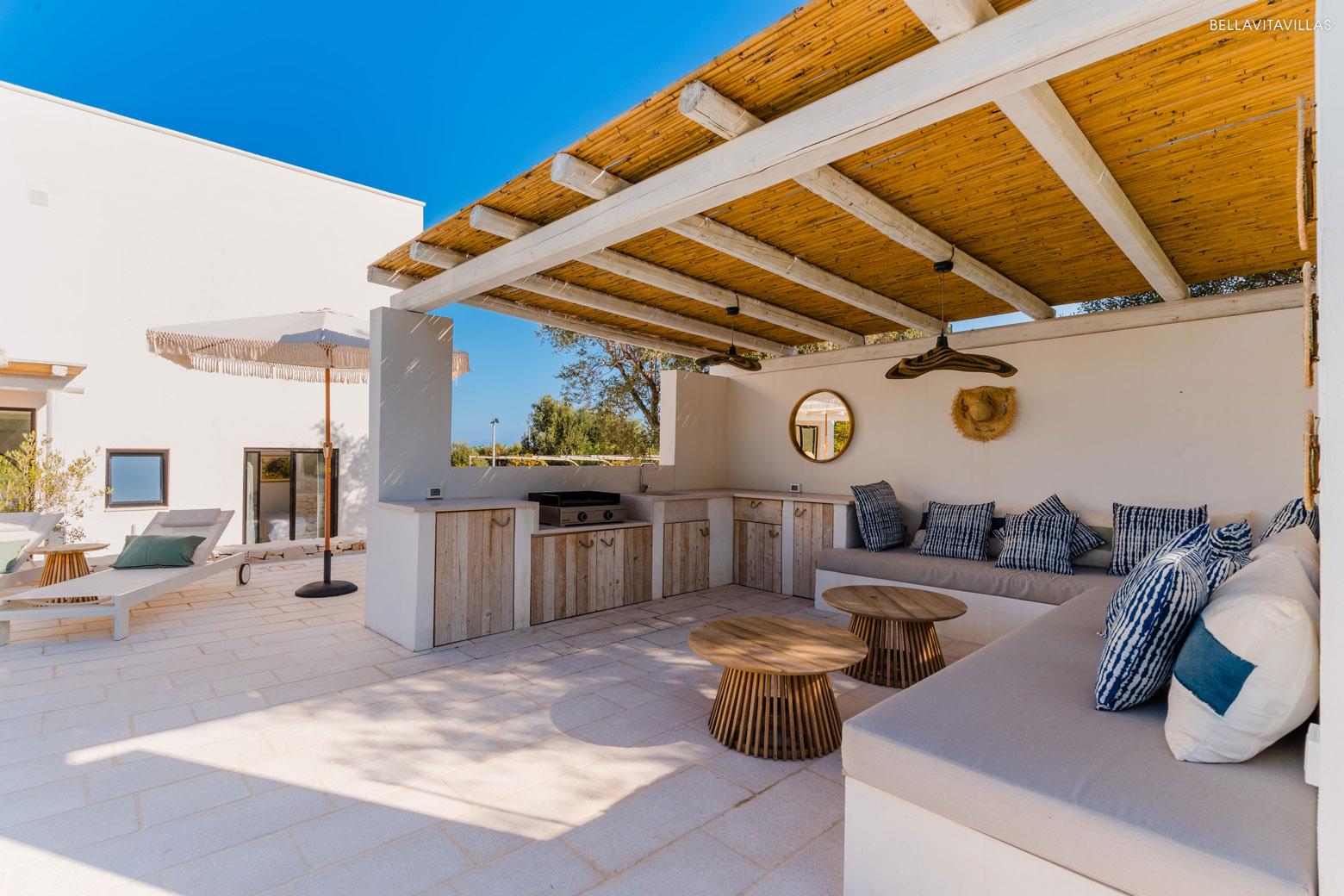 The outdoor spaces represent the quintessence of Mediterranean living. Around the beautiful swimming pool are comfortable loungers for sunbathing, letting yourself be enveloped in the unique light of this land. The reed-shaded gazebo is a comfortable barbecue area, with a grill for preparing grills and comfortable masonry benches with cushions.