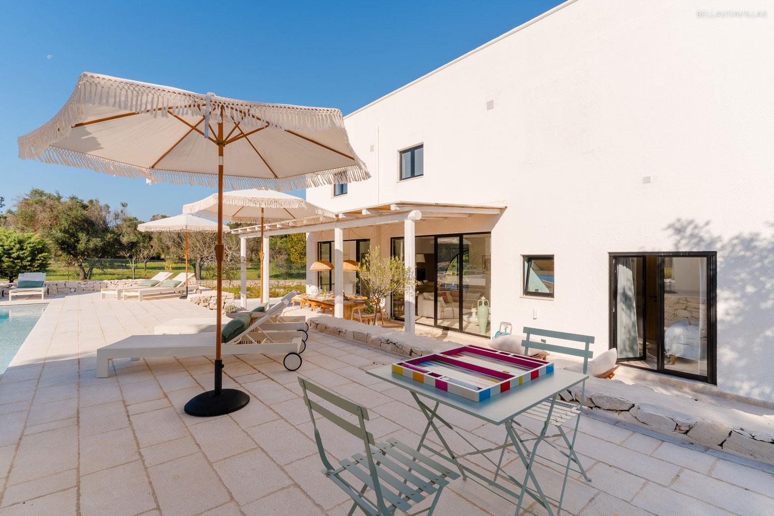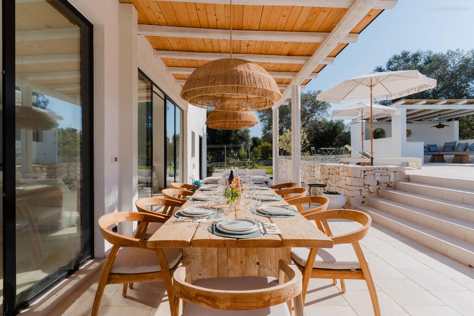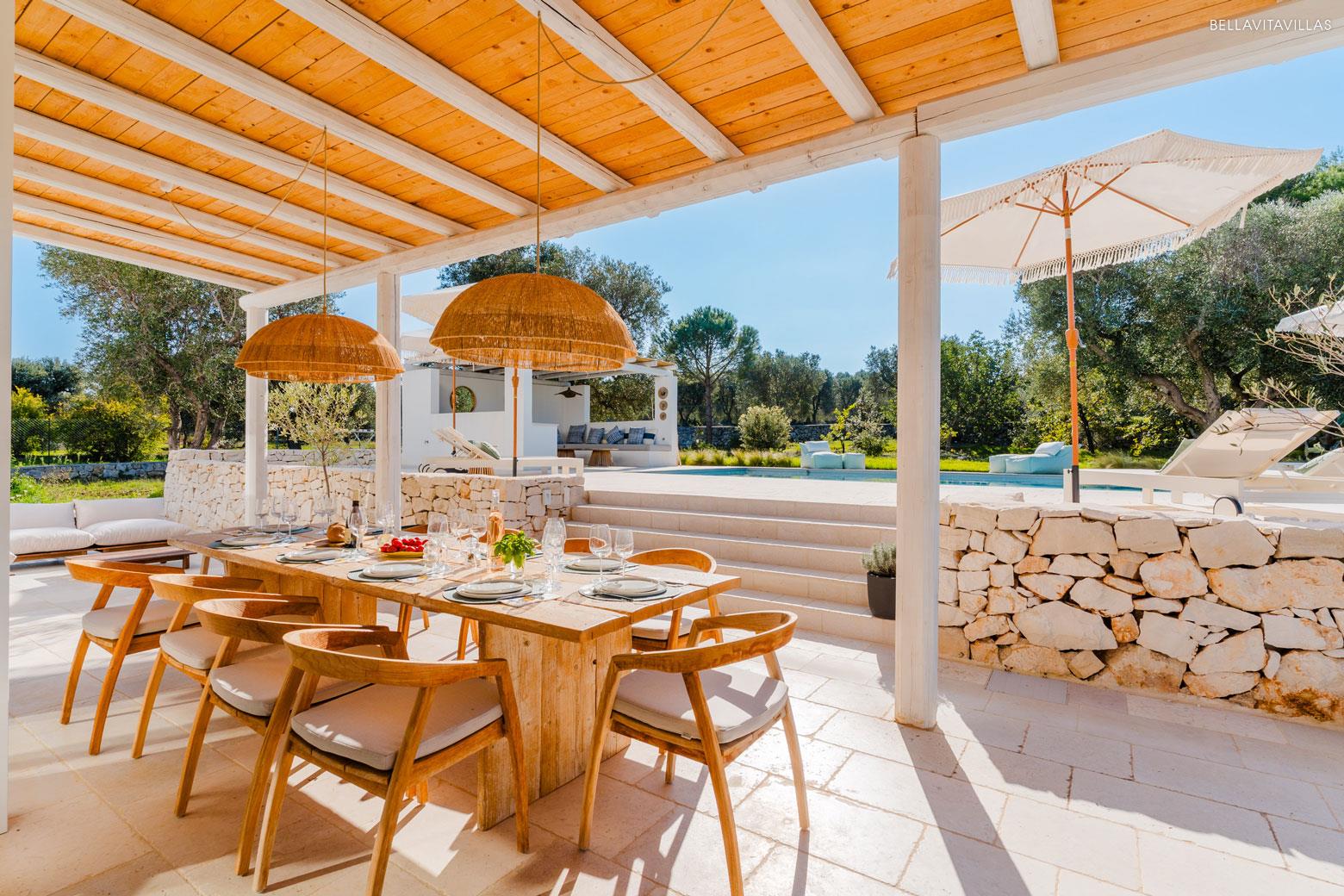 Between the pool and the villa, then, a couple of steps lead to theoutdoor dining area, a cool and bright convivial place furnished with a large table, numerous chairs and umbrellas.