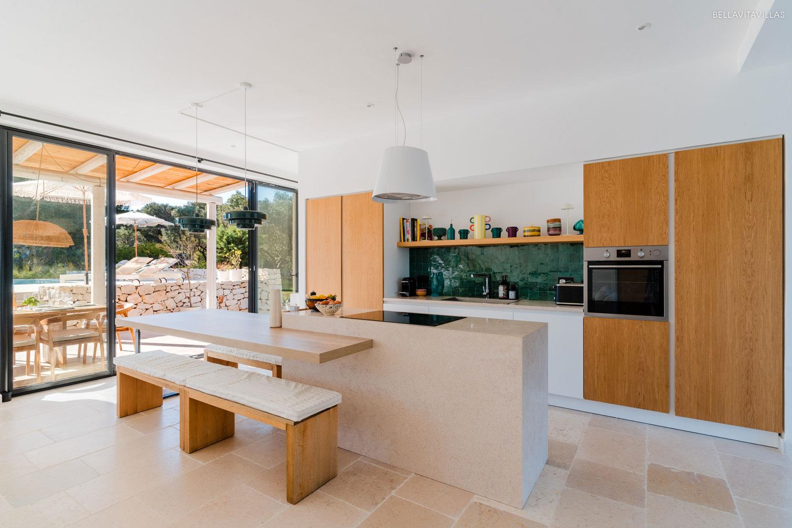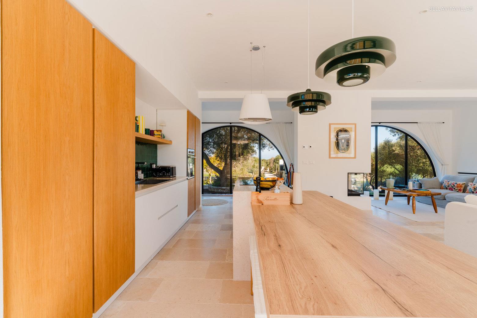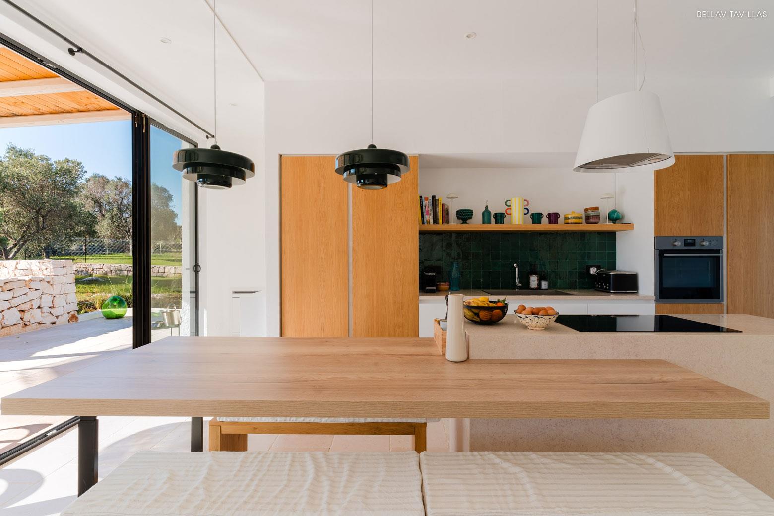 On the ground floor, the entrance is into a spacious living room with an elegant and bright character, with seating areas, modern open-plan kitchen with central island and built-in wooden table.