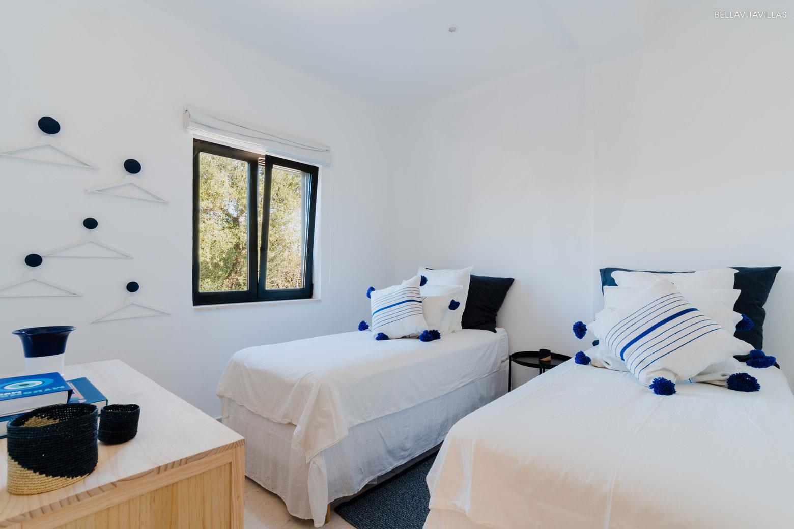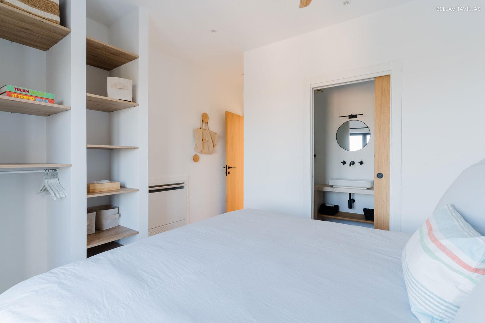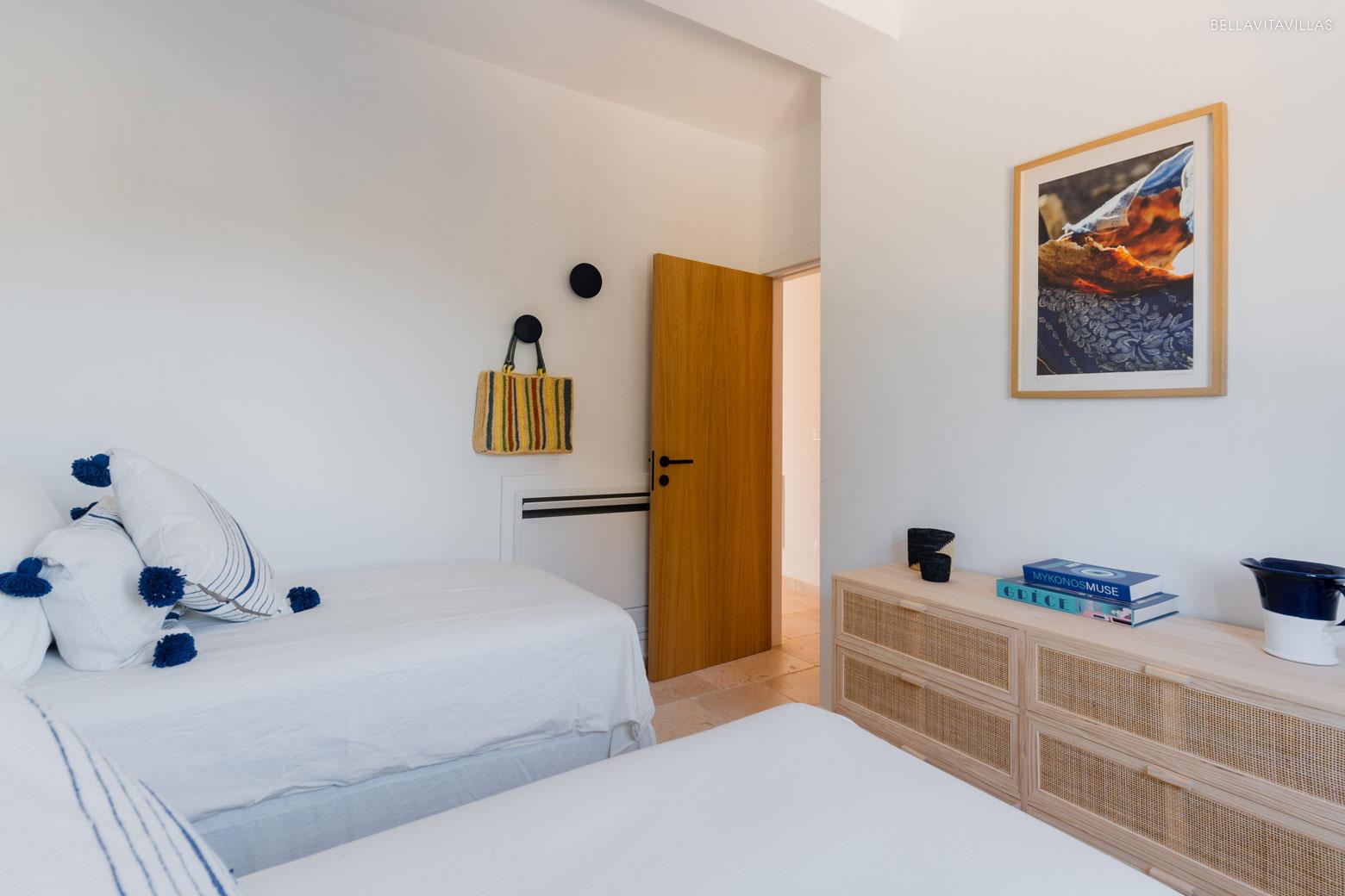 A hallway leads to the ground floor sleeping area, consisting of 1 master bedroom suite, 1 twin bedroom with single beds, 1 full bathroom with double sinks and 1 half bathroom with toilet and washbasin. There is, finally, the laundry room equipped with a washer and dryer.