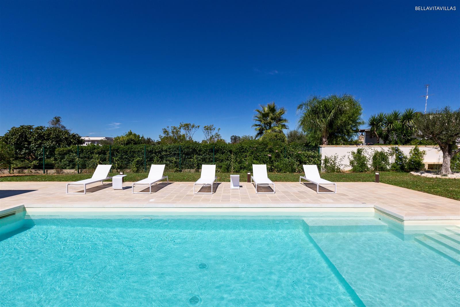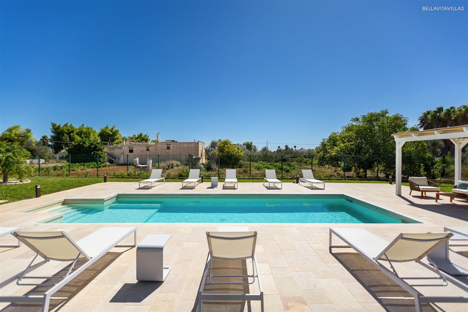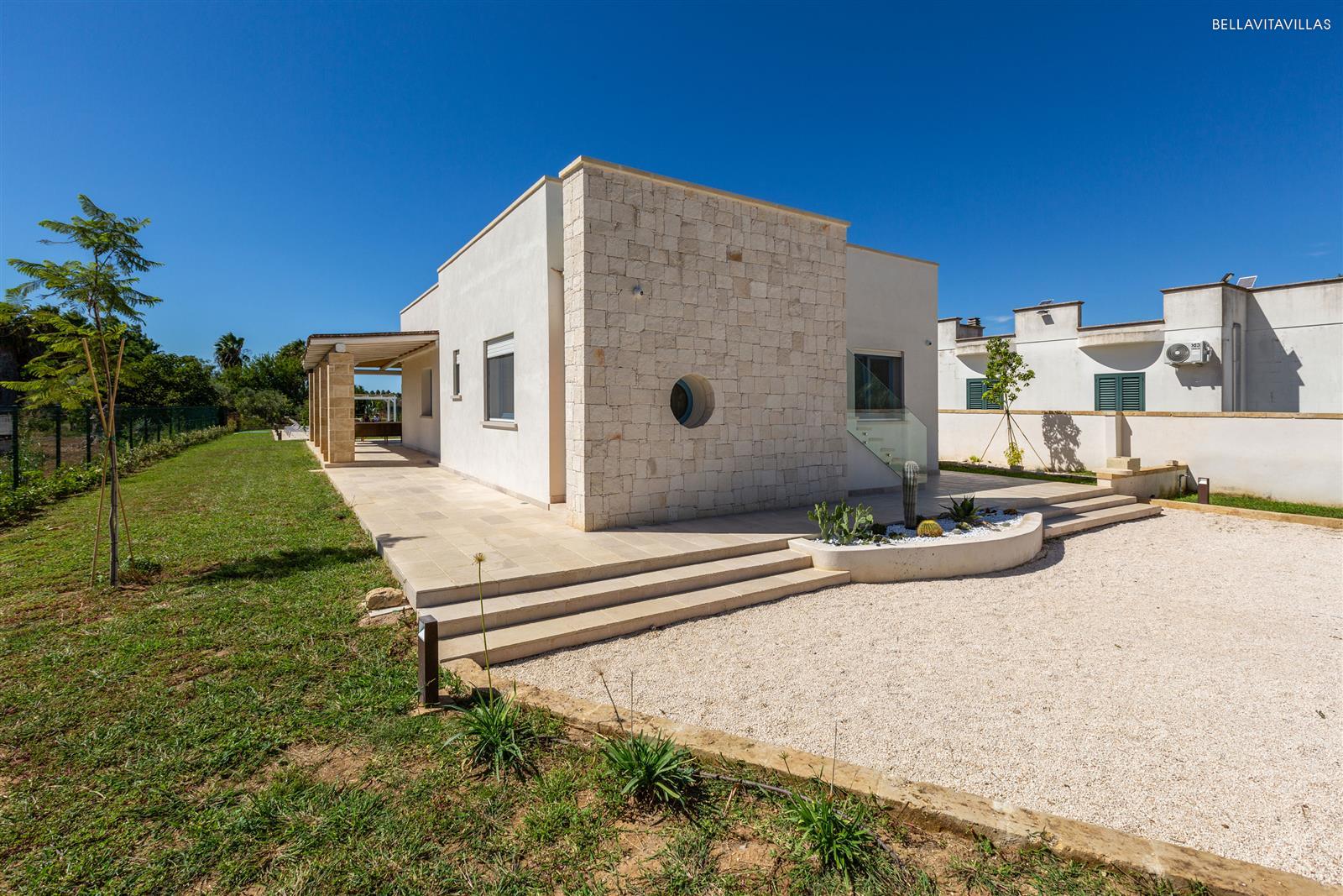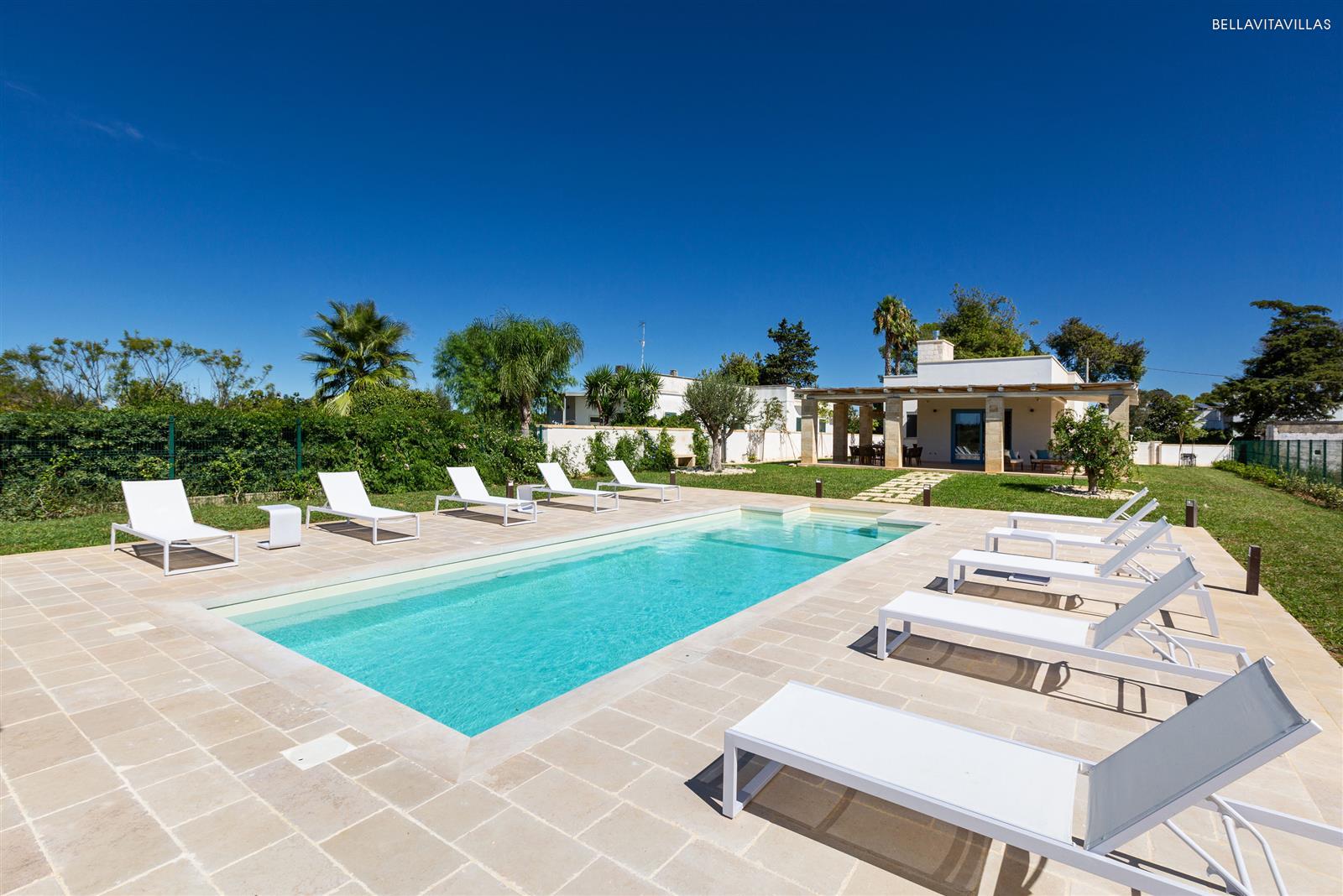 Villa Le Pozze is a prestigious and brand new villa with swimming pool, large garden with lawn and equipped outdoor spaces to spend absolutely relaxing vacations in Salento, in the area of Gallipoli.
