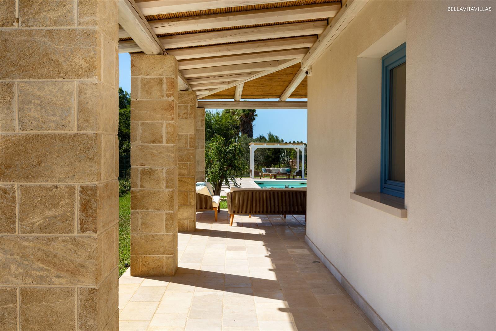 The outdoor space is well-kept, embellished with lawn and pool area with solarium, comfortable sitting area with gazebo and airy shaded veranda where you can have lunch and dinner outdoors, and relax in the cool.