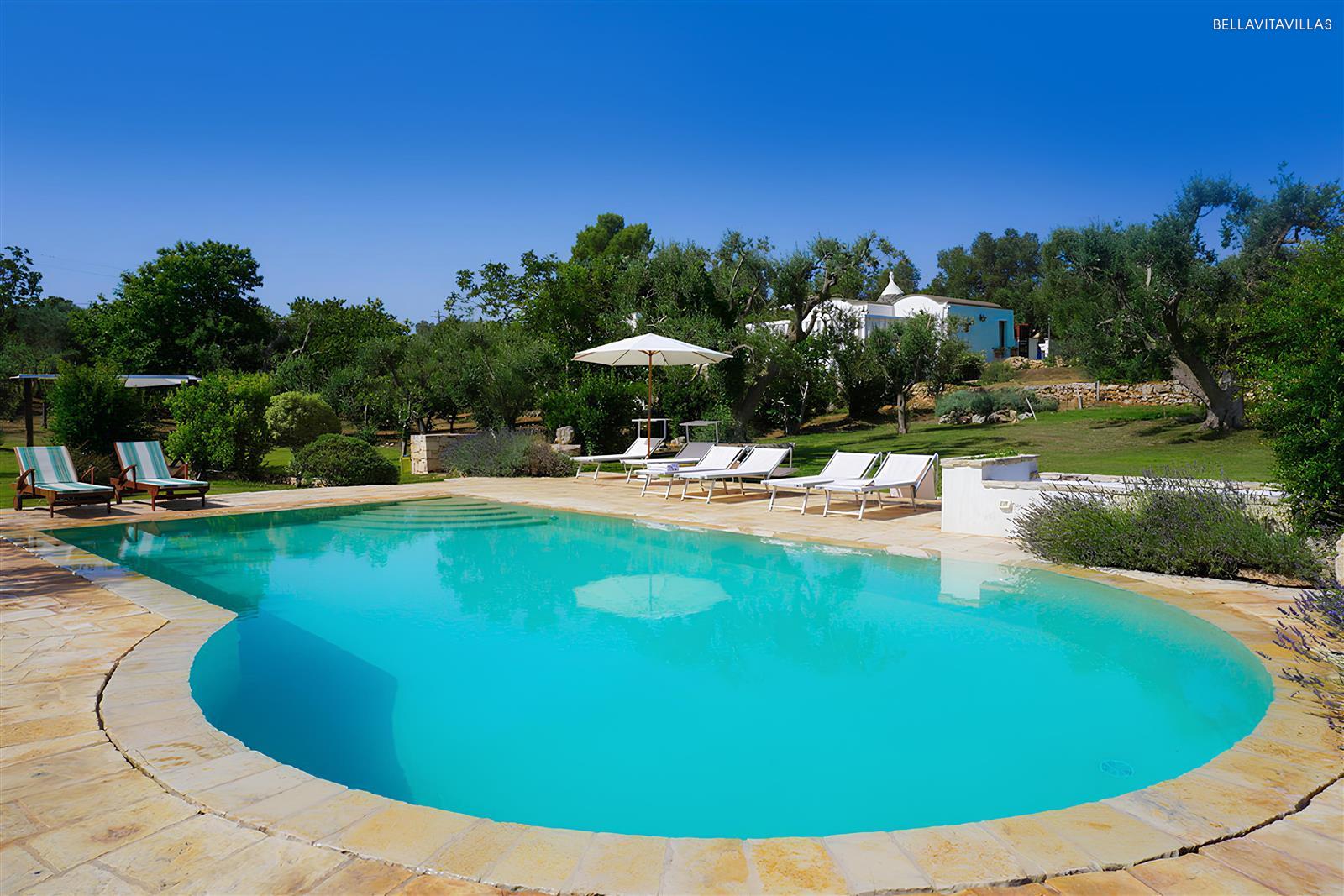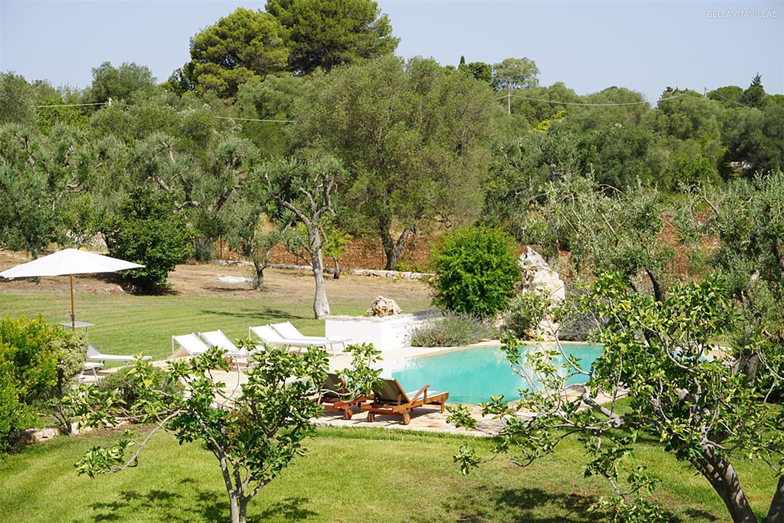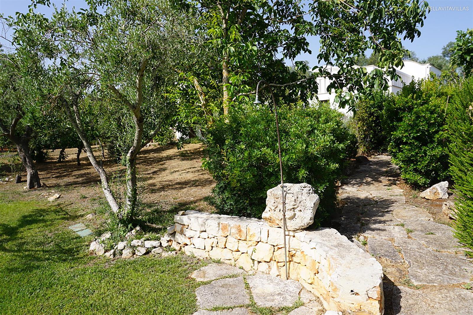 Immersa in un grande giardino curatissimo, con prato inglese, ulivi secolari, pergolato di vite ed essenze mediterranee, la tenuta ha una splendida area piscina con lettini per il solarium, spazi esterni attrezzati, barbecue in muratura e doccia esterna.