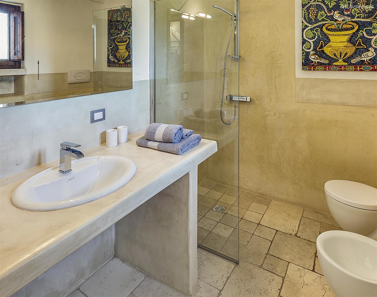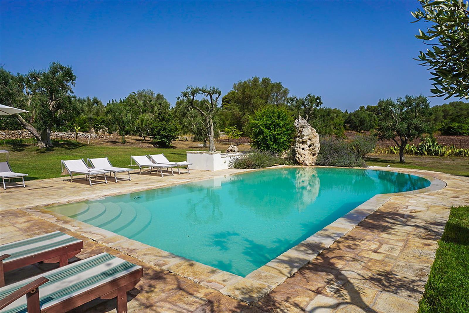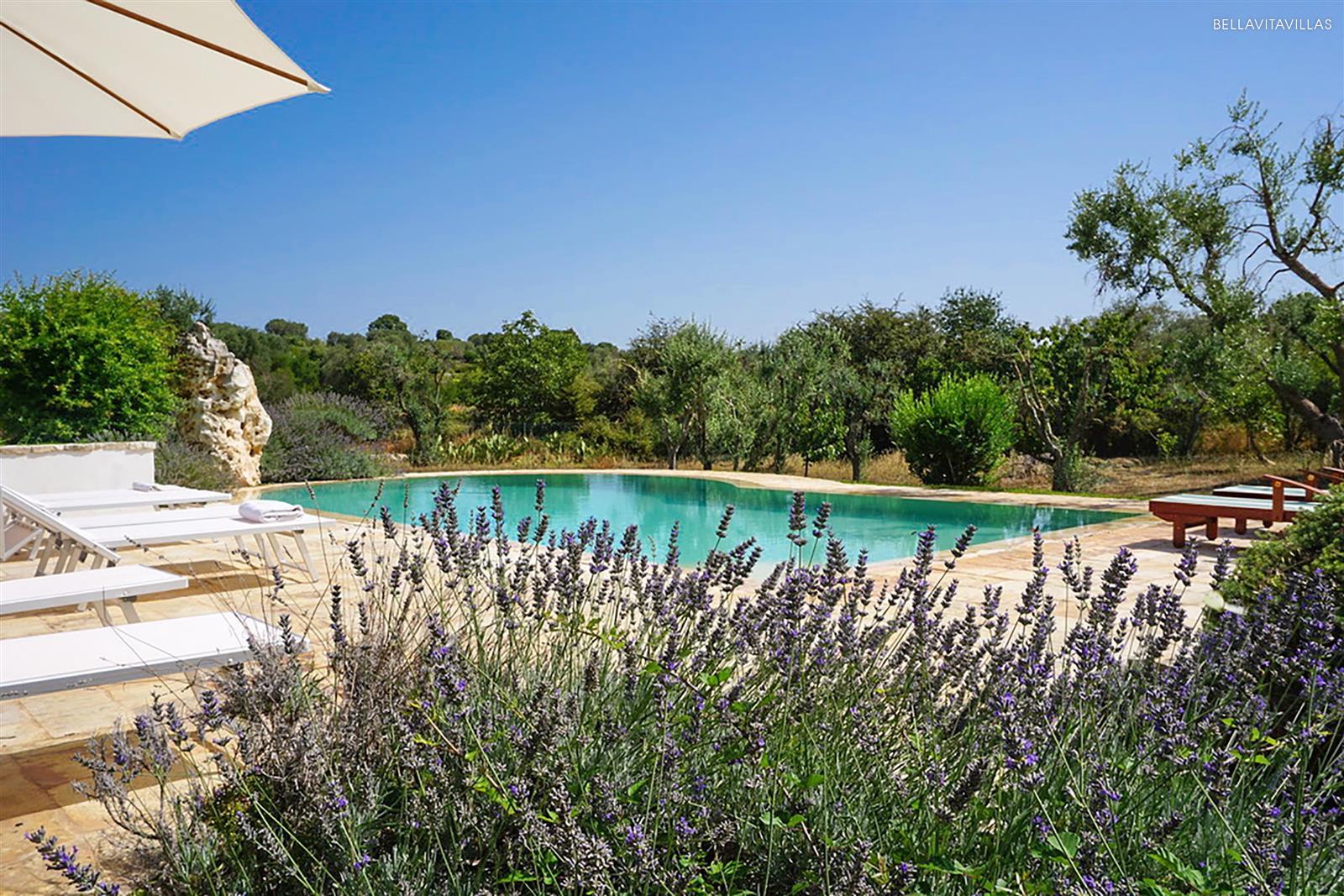 Immersa in un grande giardino curatissimo, con prato inglese, ulivi secolari, pergolato di vite ed essenze mediterranee, la tenuta ha una splendida area piscina con lettini per il solarium, spazi esterni attrezzati, barbecue in muratura e doccia esterna.