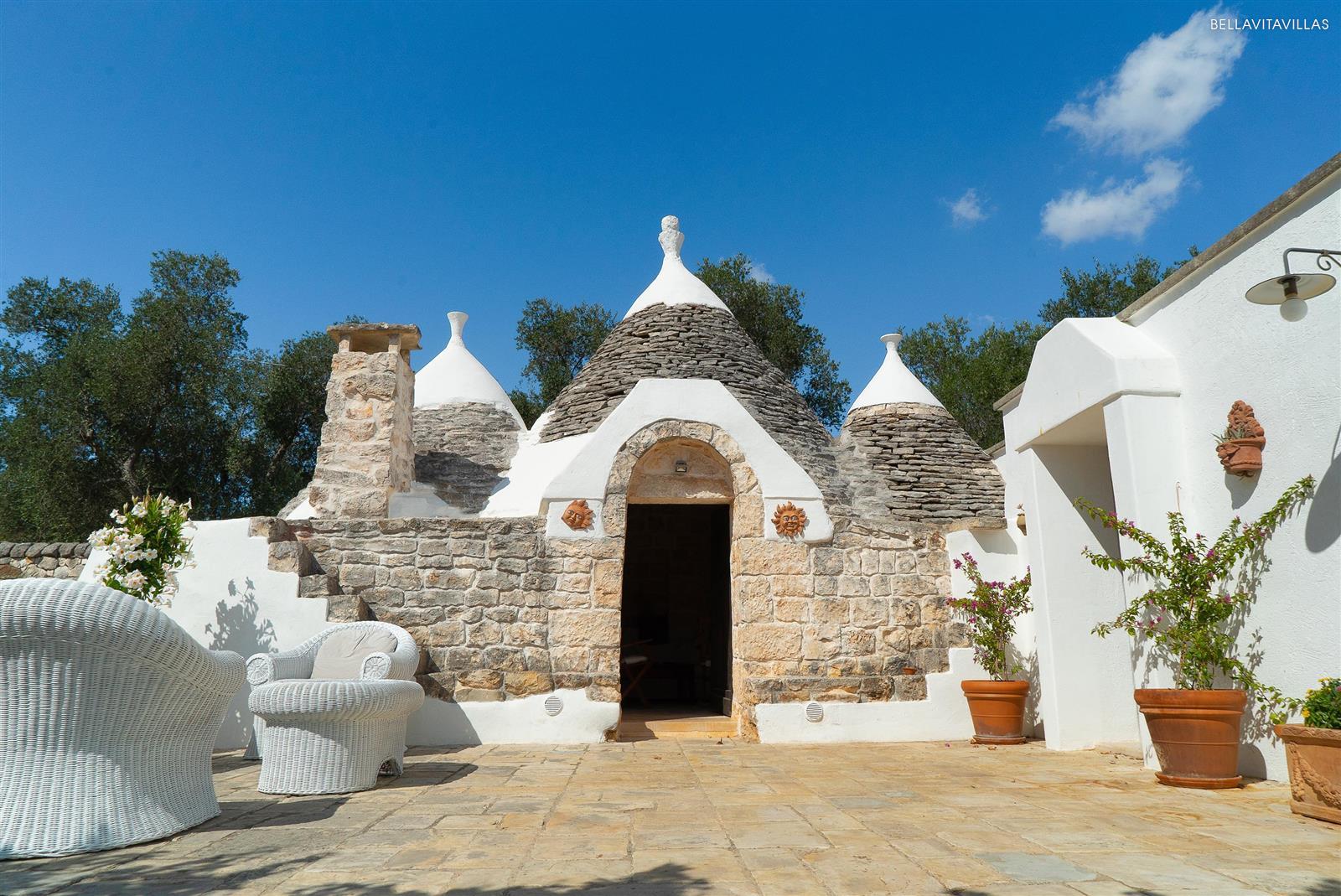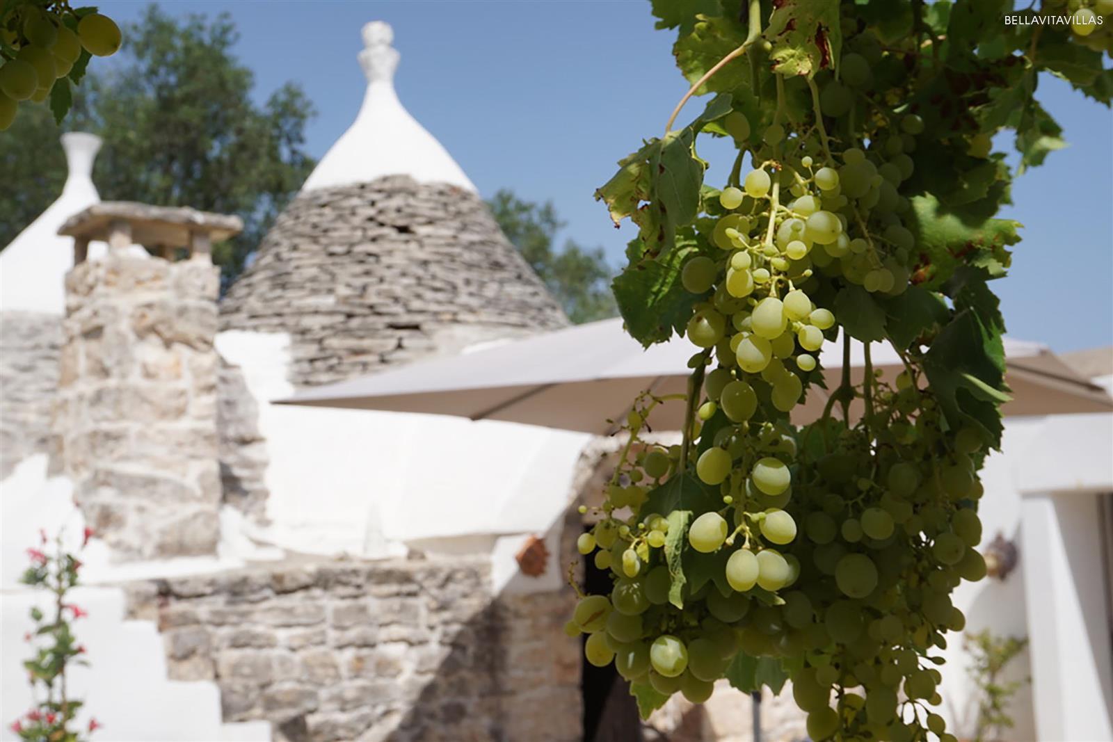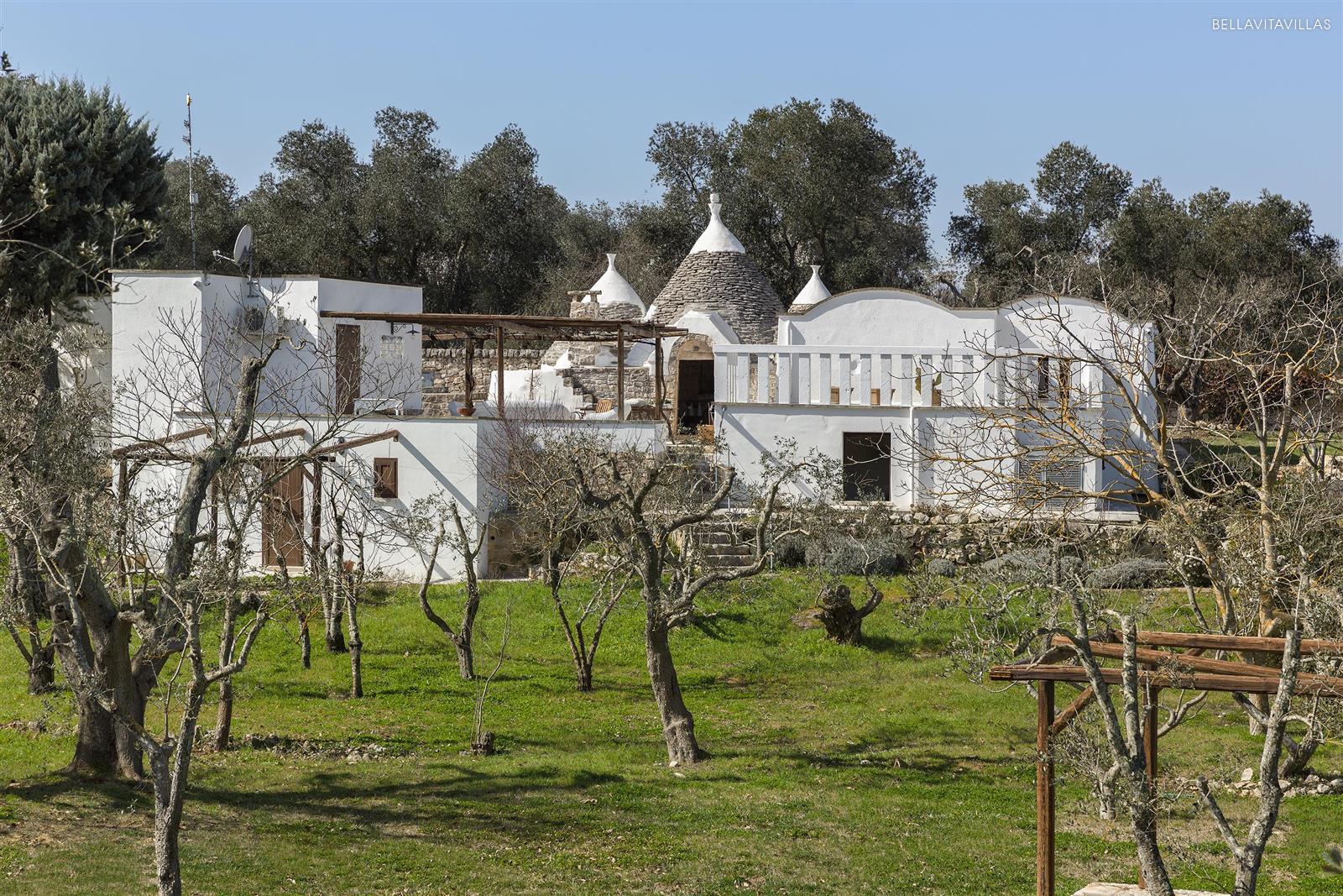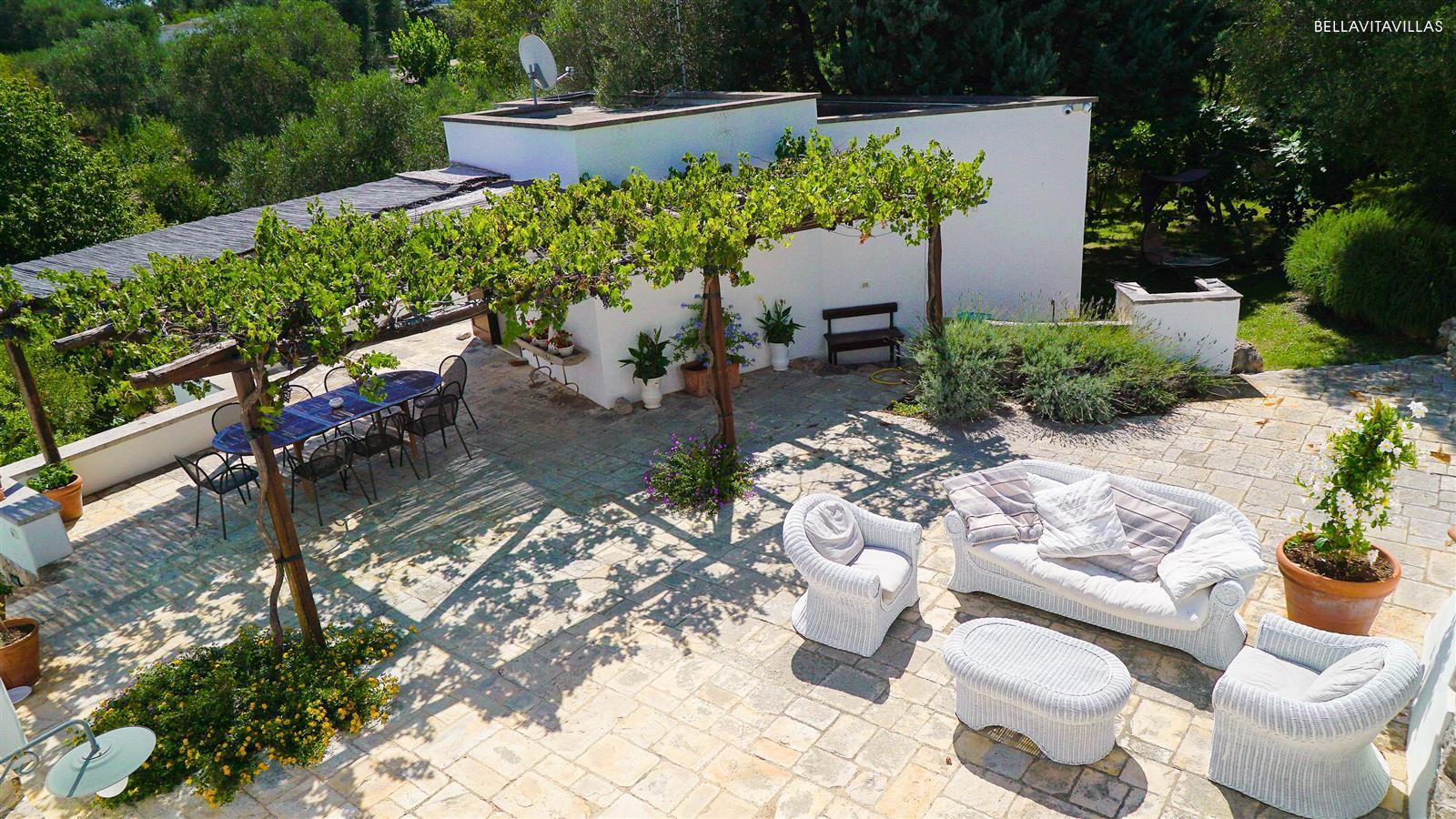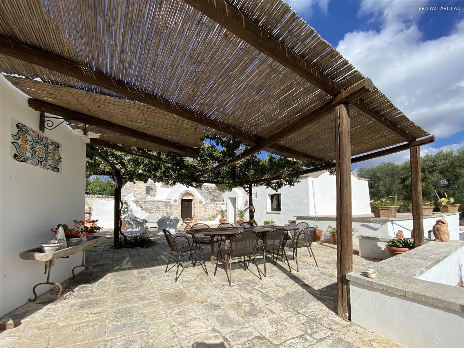 Tante le aree relax attrezzate in giardino: la grande piscina è attorniata da comodi lettini prendisole; l`area pranzo esterna è coperta da cannucciato e pergolato di vite; il salottino esterno è situato proprio accanto ai bellissimi trulli.