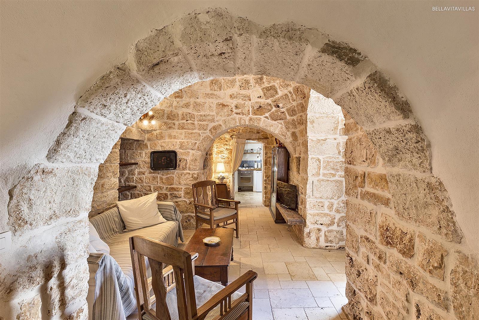 Si passa poi alla sala da pranzo con cucina a vista. Da qui si accede sia al trullo arredato come zona living con caminetto, sia alla 1 camera tripla arredata con letto matrimoniale + letto singolo. La camera con bagno en suite ha un`ampia finestra d`accesso diretto al giardino.