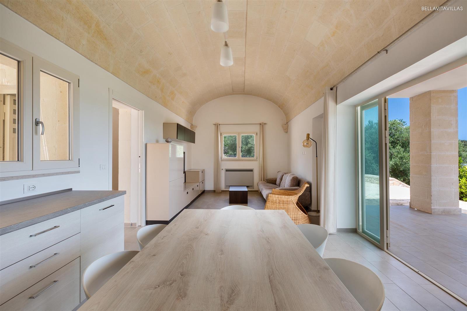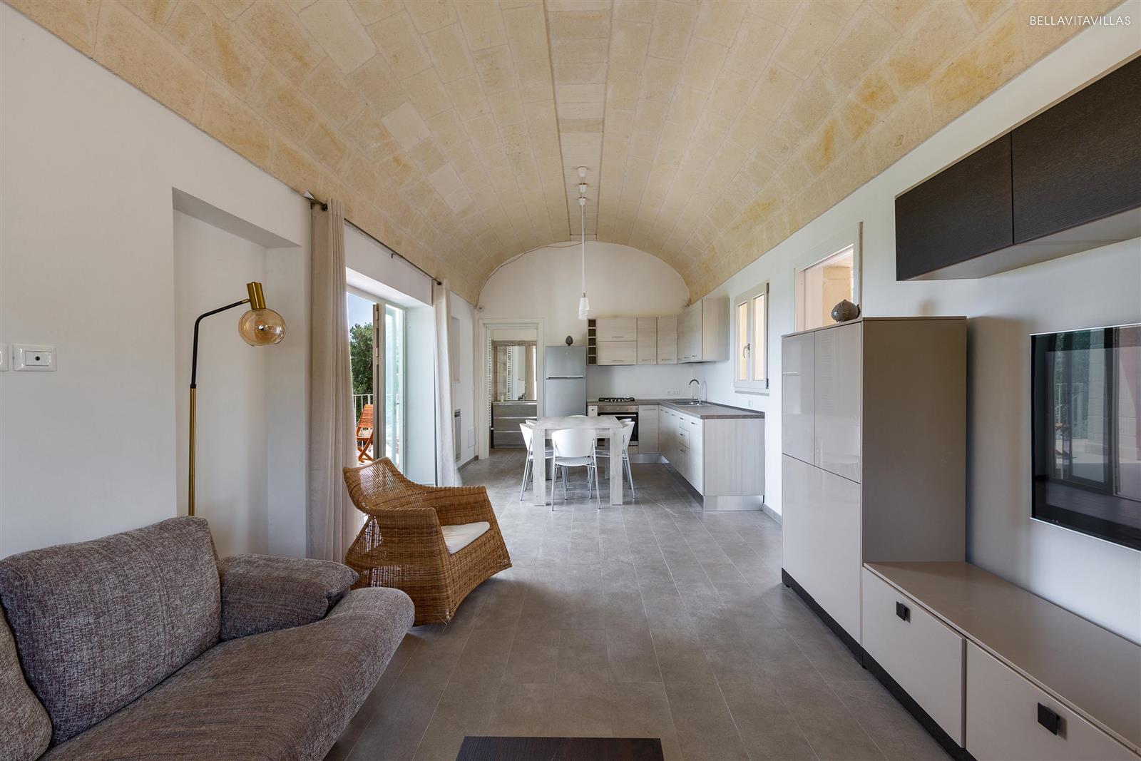 Al piano terra vi è l`ampio soggiorno arredato con divano letto matrimoniale e grande tv a schermo piatto. Accanto, la cucina è spaziosa e ben equipaggiata. Completa il piano terra il bagno con doccia. Le volte a botte con pietre a vista rendono questo open space accogliente e in perfetta armonia con la tradizione architettonica pugliese.