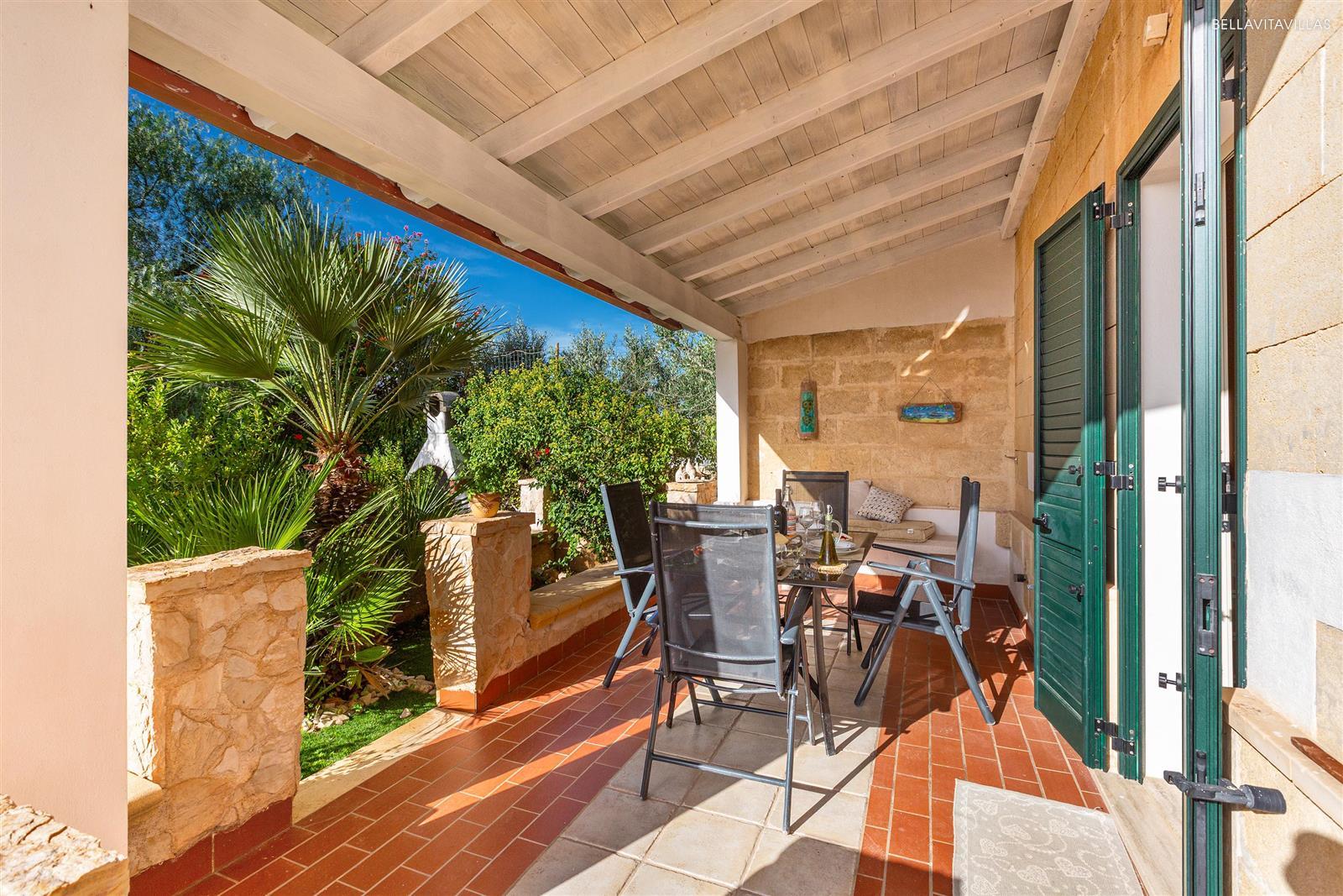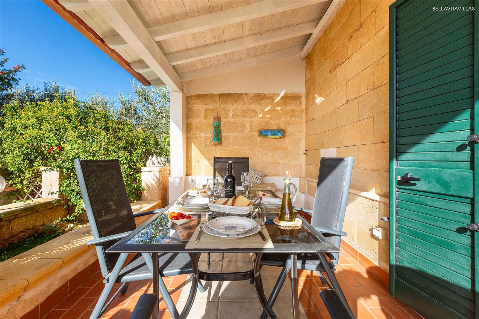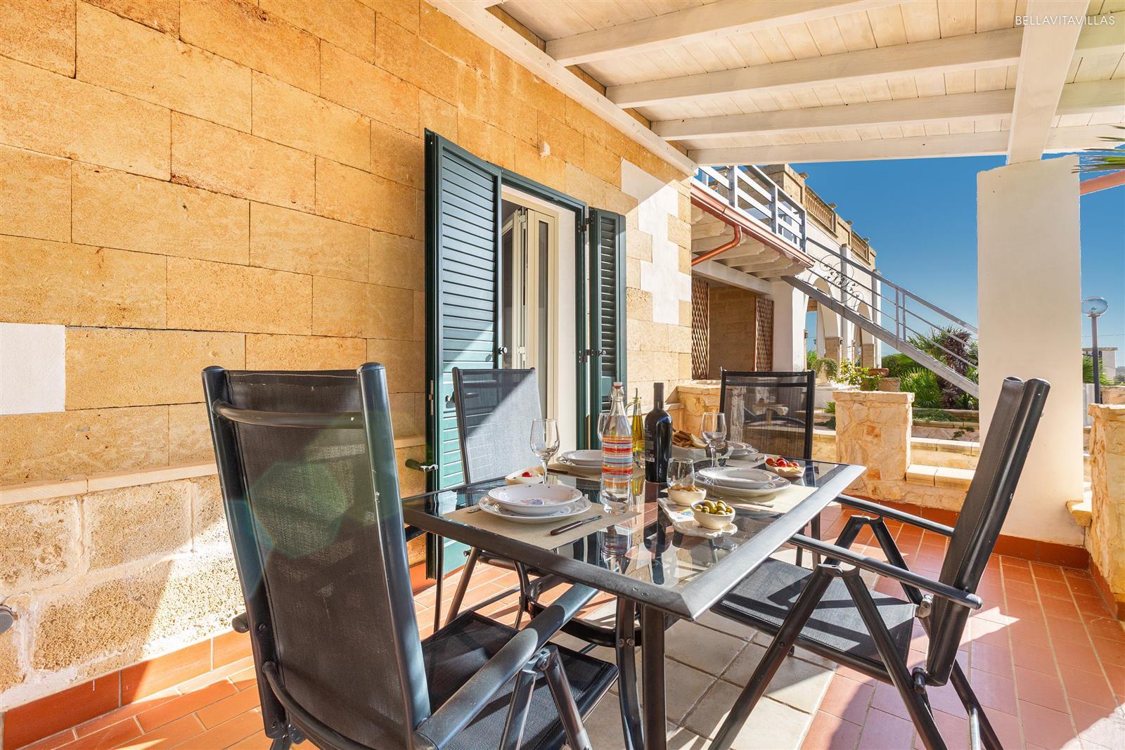 È introdotto da una veranda di pertinenza esclusiva, arredata con tavolo e sedie, dove si può pranzare e cenare all`aperto, al fresco.