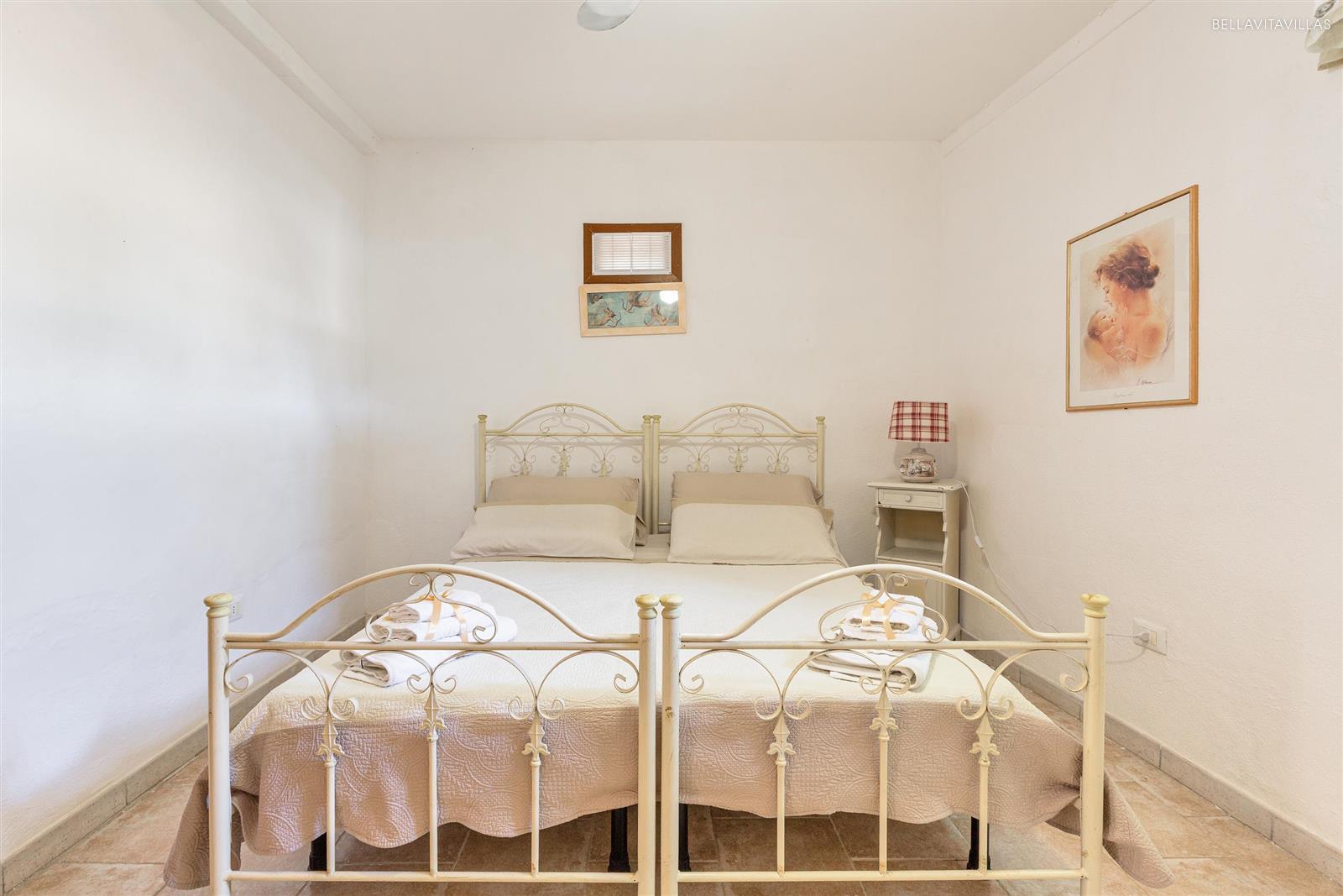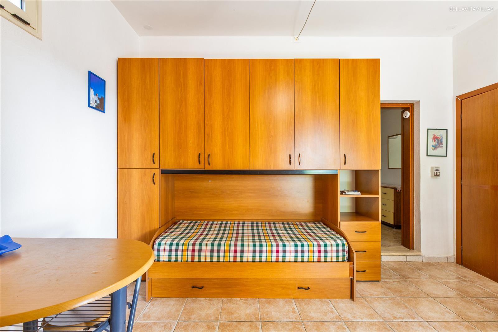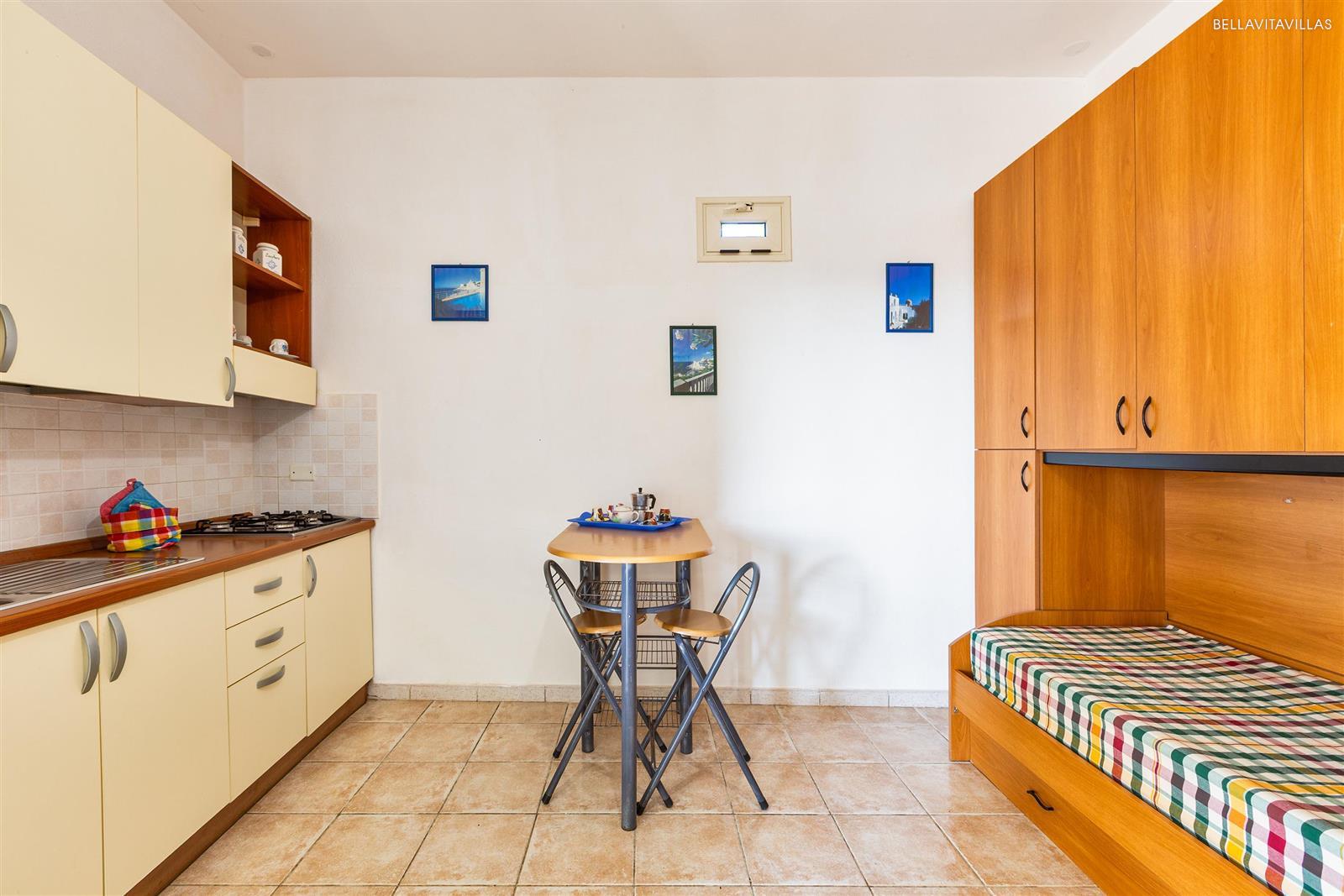 Gli interni sono divisi in due ambienti: l`ingresso è arredato con angolo cottura e 1 letto singolo con armadio. Il secondo ambiente è una camera matrimoniale. Infine vi è il bagno doccia completo.