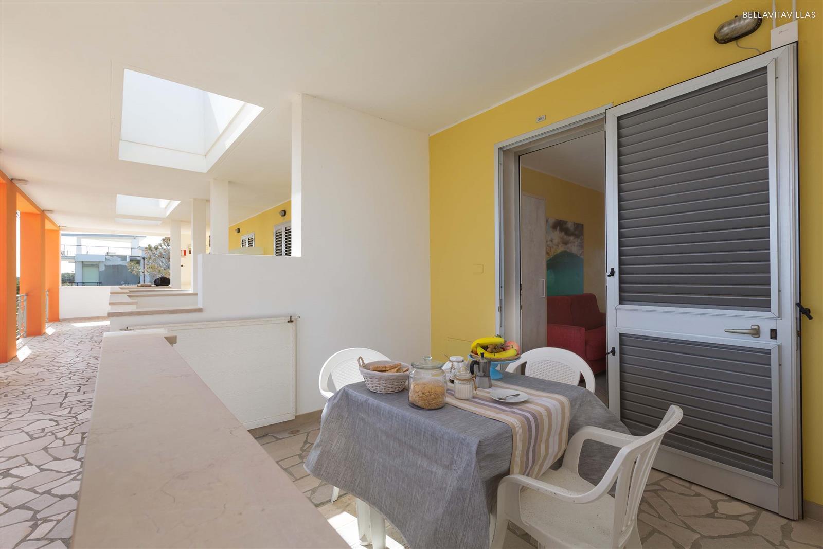 I bilocali al primo piano del Residence Solaris sono case vacanze a soli 10 metri dalla bellissima spiaggia che si trova di fronte. Sono tutti introdotti da un cancelletto che permette l`accesso in una piccola veranda attrezzata con tavolo e sedie per cenare all`aperto, vista mare e vista piscina.