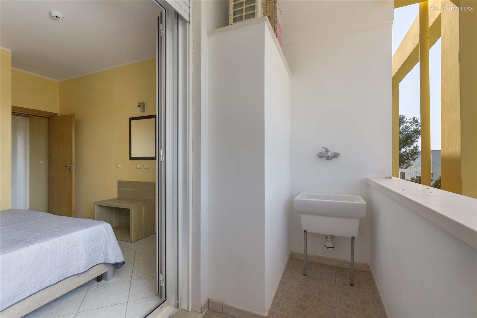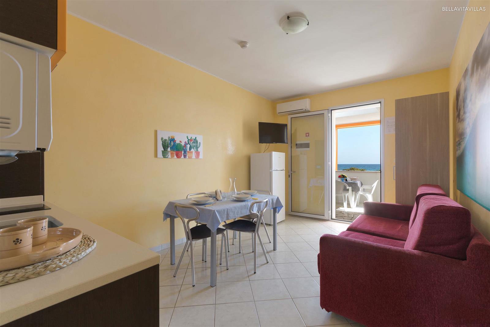 Gli interni sono semplici, accoglienti e luminosi formati da soggiorno climatizzato con angolo cottura e 1 divano letto matrimoniale, tavolo e sedie. Un piccolo disimpegno porta alla camera matrimoniale climatizzata, con accesso all`esterno in una piccola veranda coperta, ed al bagno doccia.
