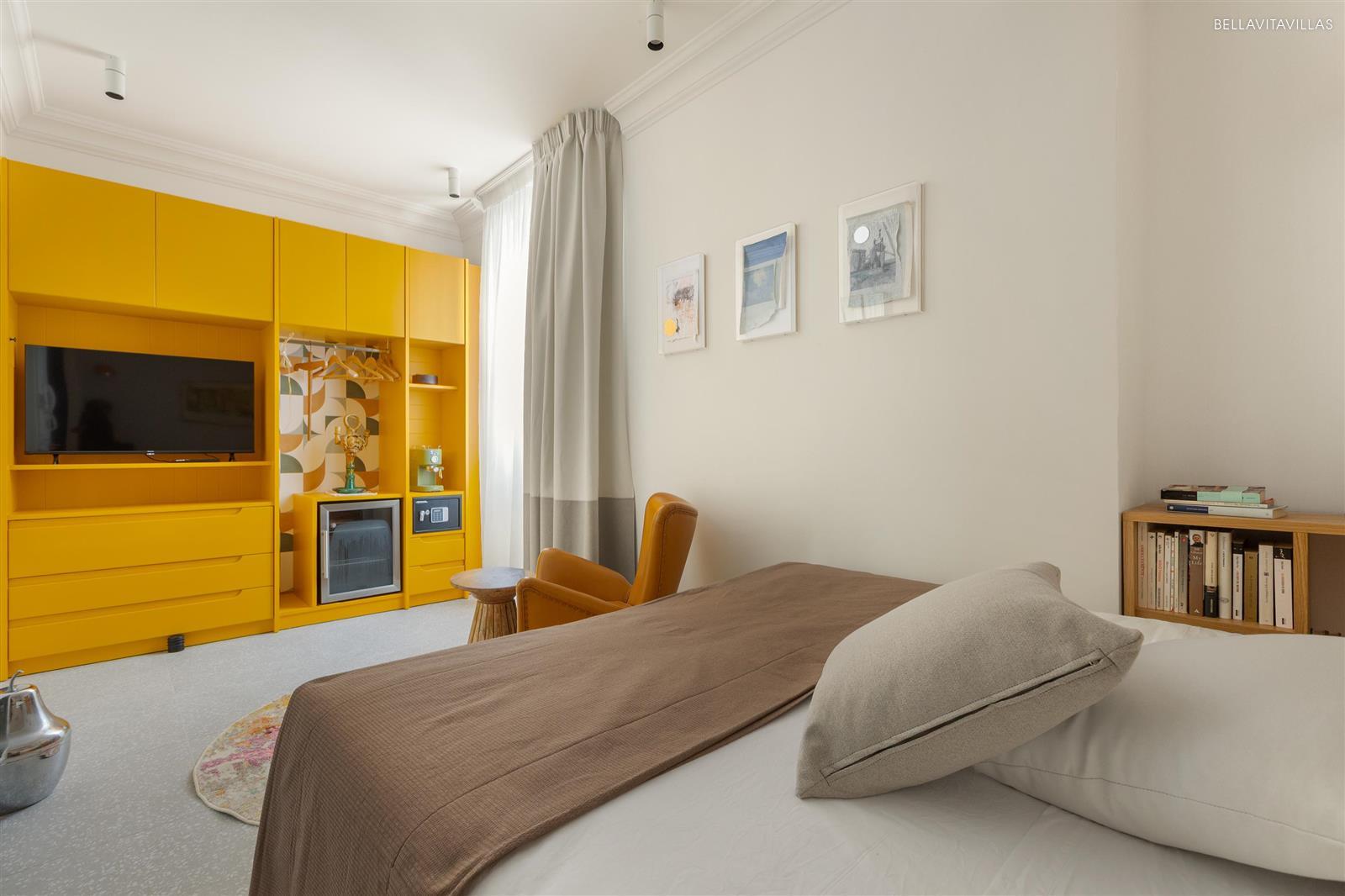 La camera è completa di accessori come aria condizionata, smart tv, internet wi-fi, mini frigo, macchina per il caffè, cassaforte, riscaldamenti ed ha una parete attrezzata con cabina armadio.
