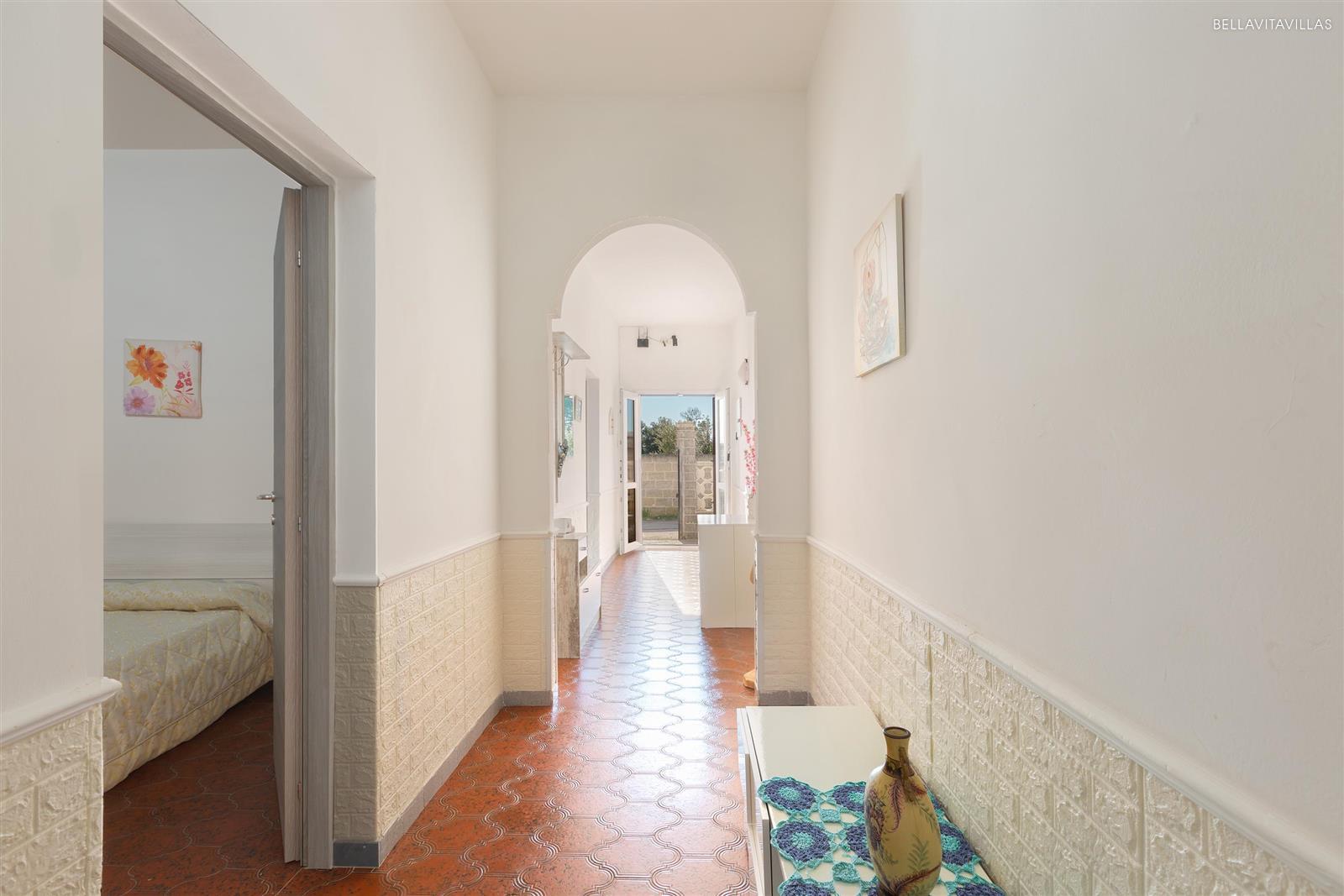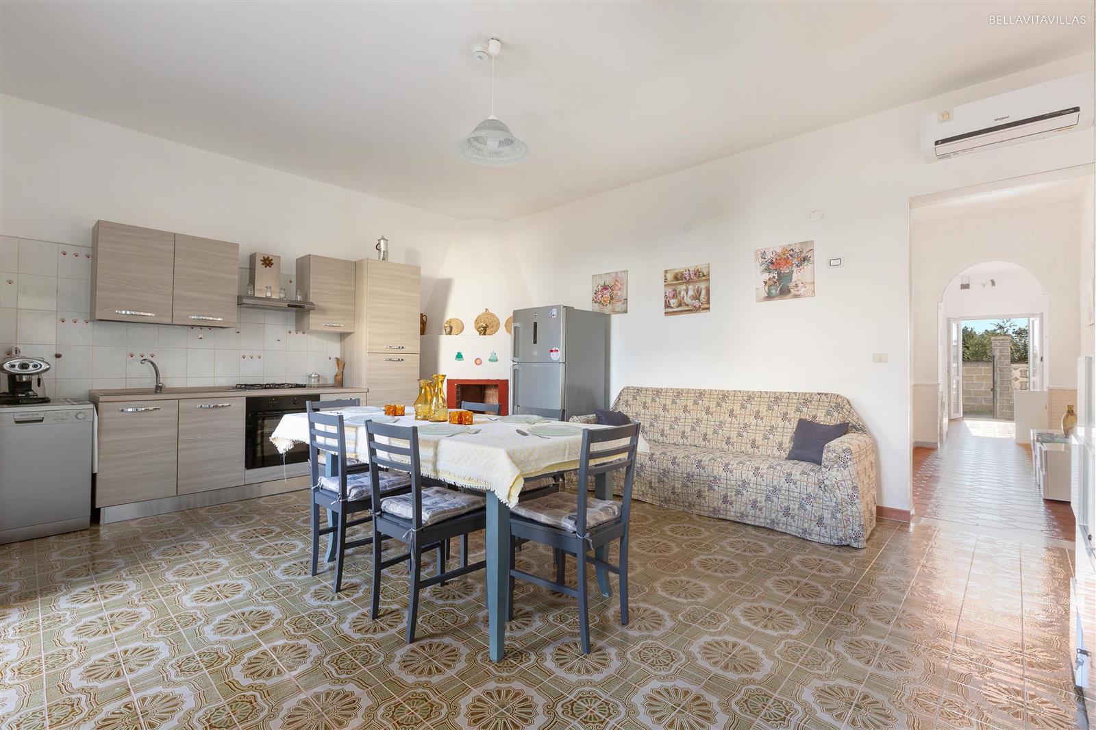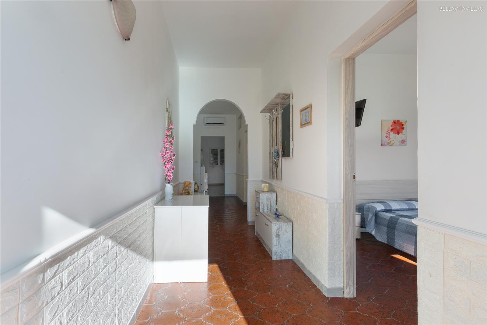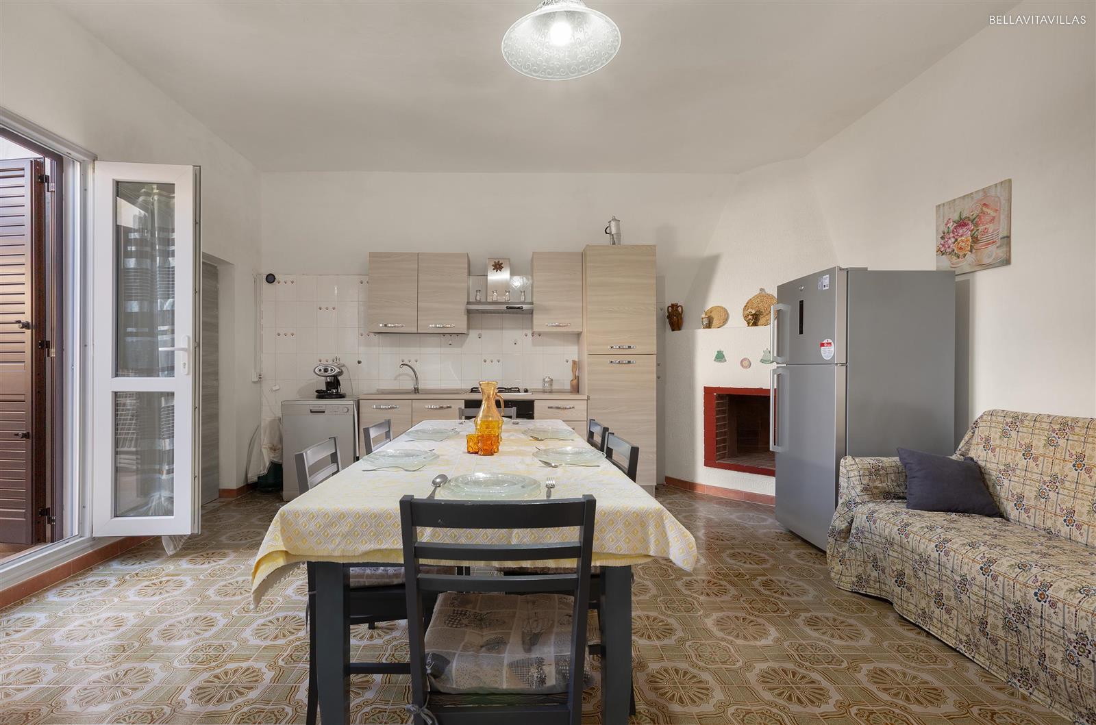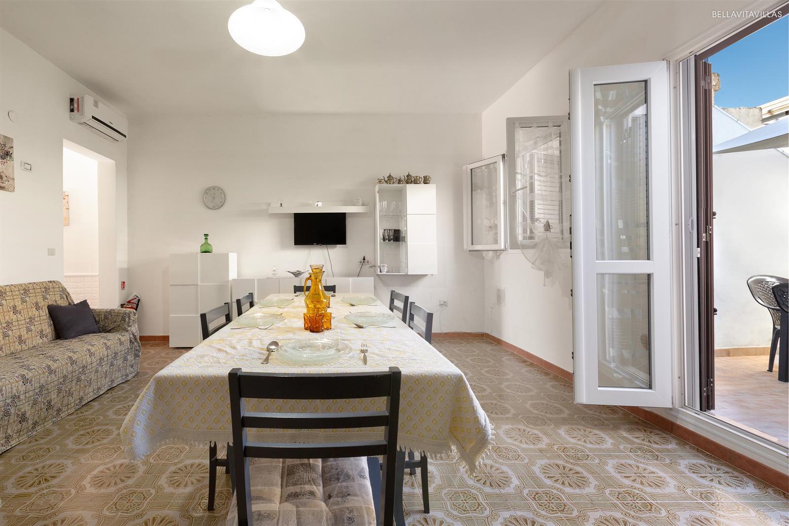 Da qui si entra in casa. Un disimpegno porta ai diversi ambienti. La zona giorno è arredata con cucina a vista, 1 divano letto matrimoniale, sala da pranzo e tv.
