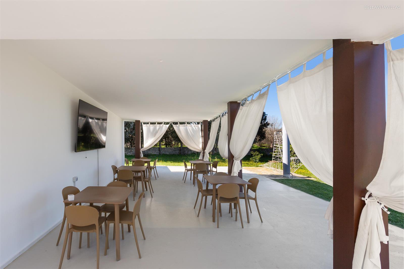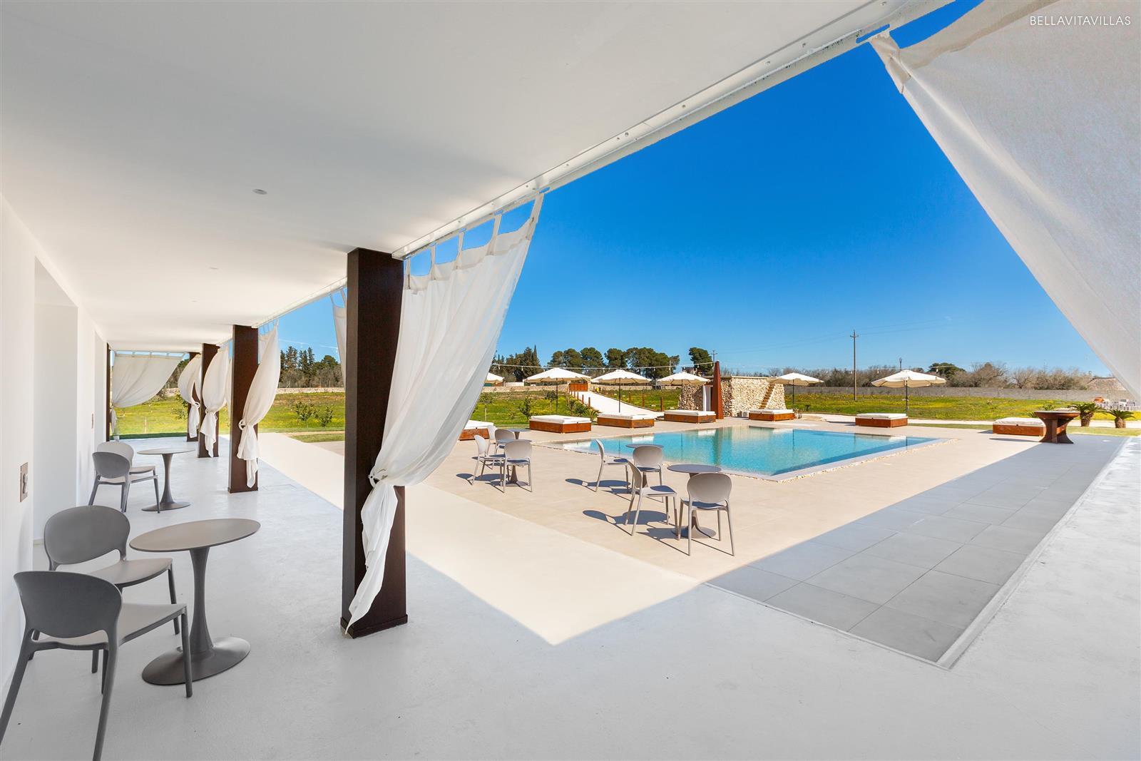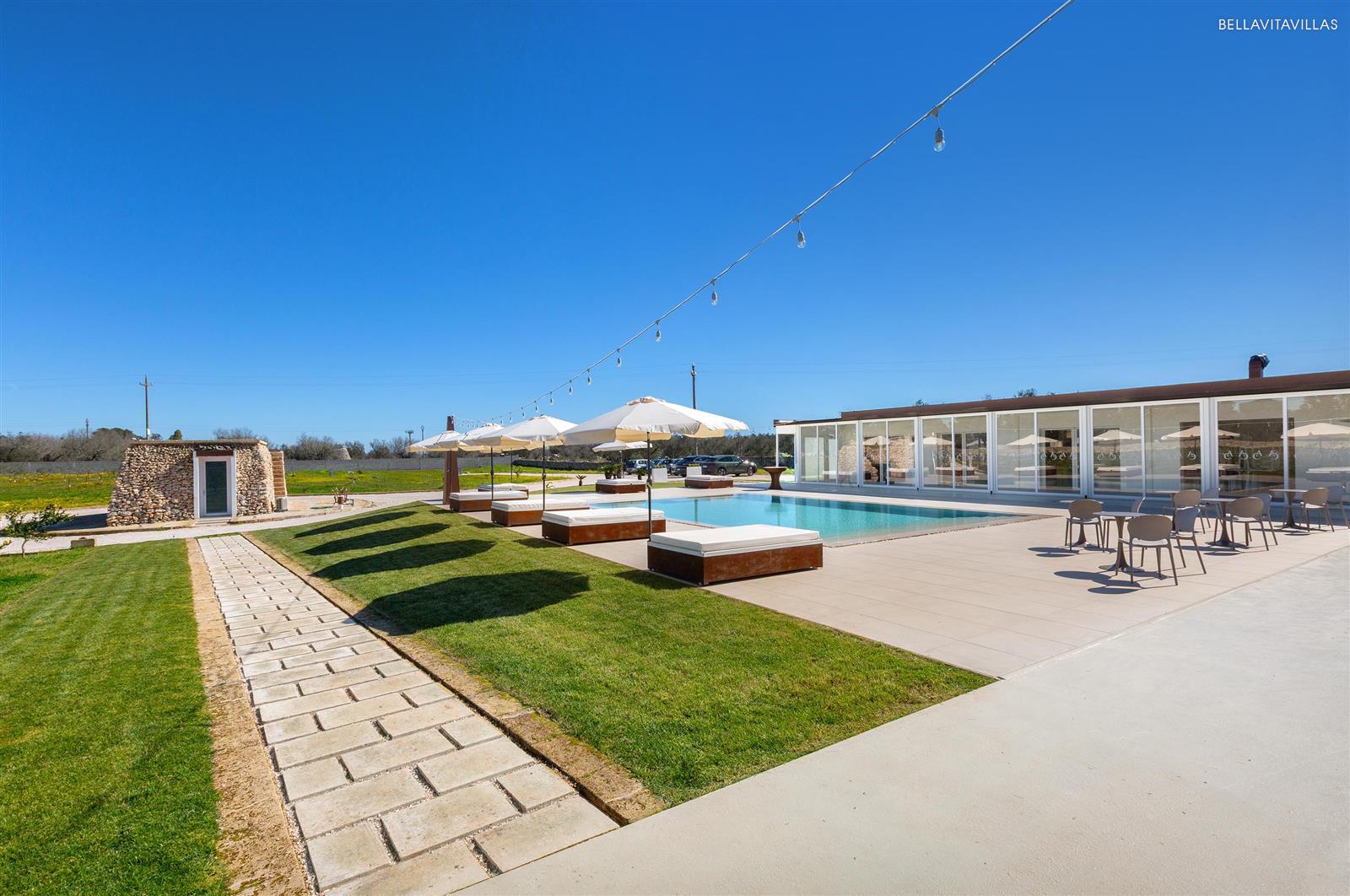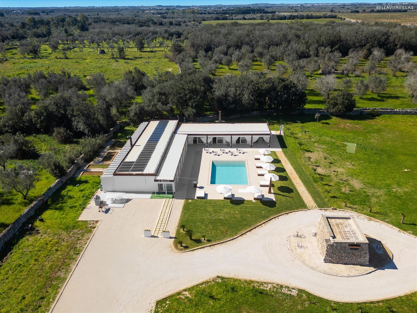 The masseria is surrounded by greenery, enriched with an infinity pool, solarium and large common areas, outdoor shower and spacious gazebo equipped with 85" TV.