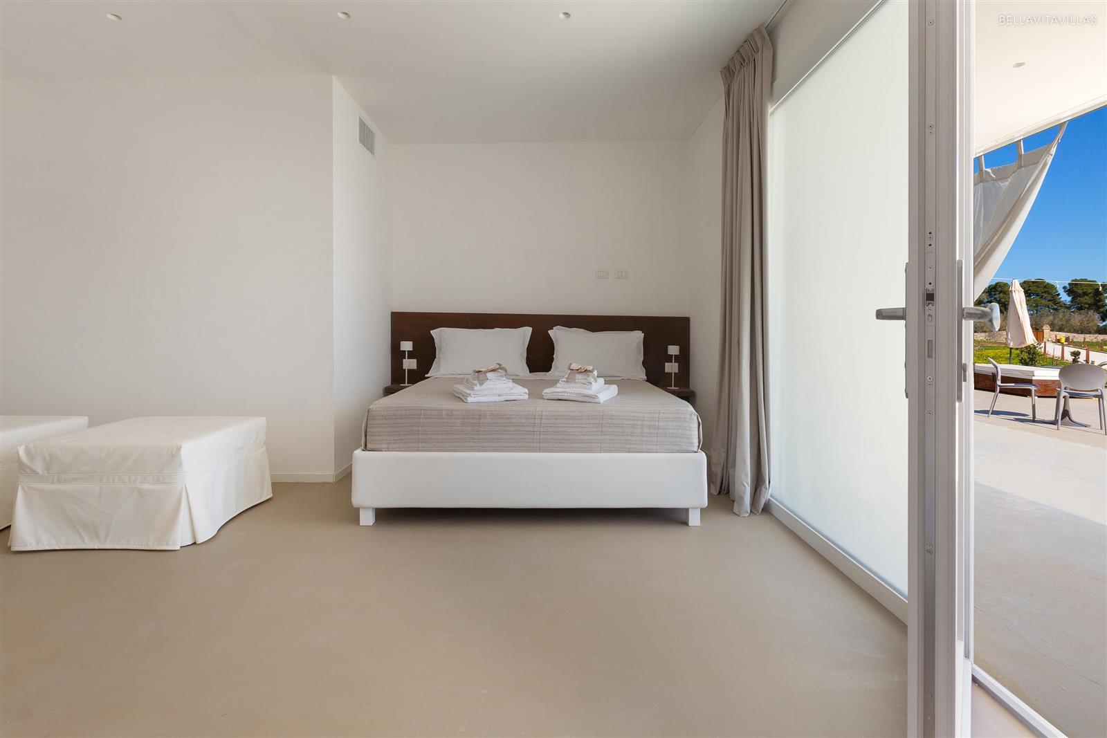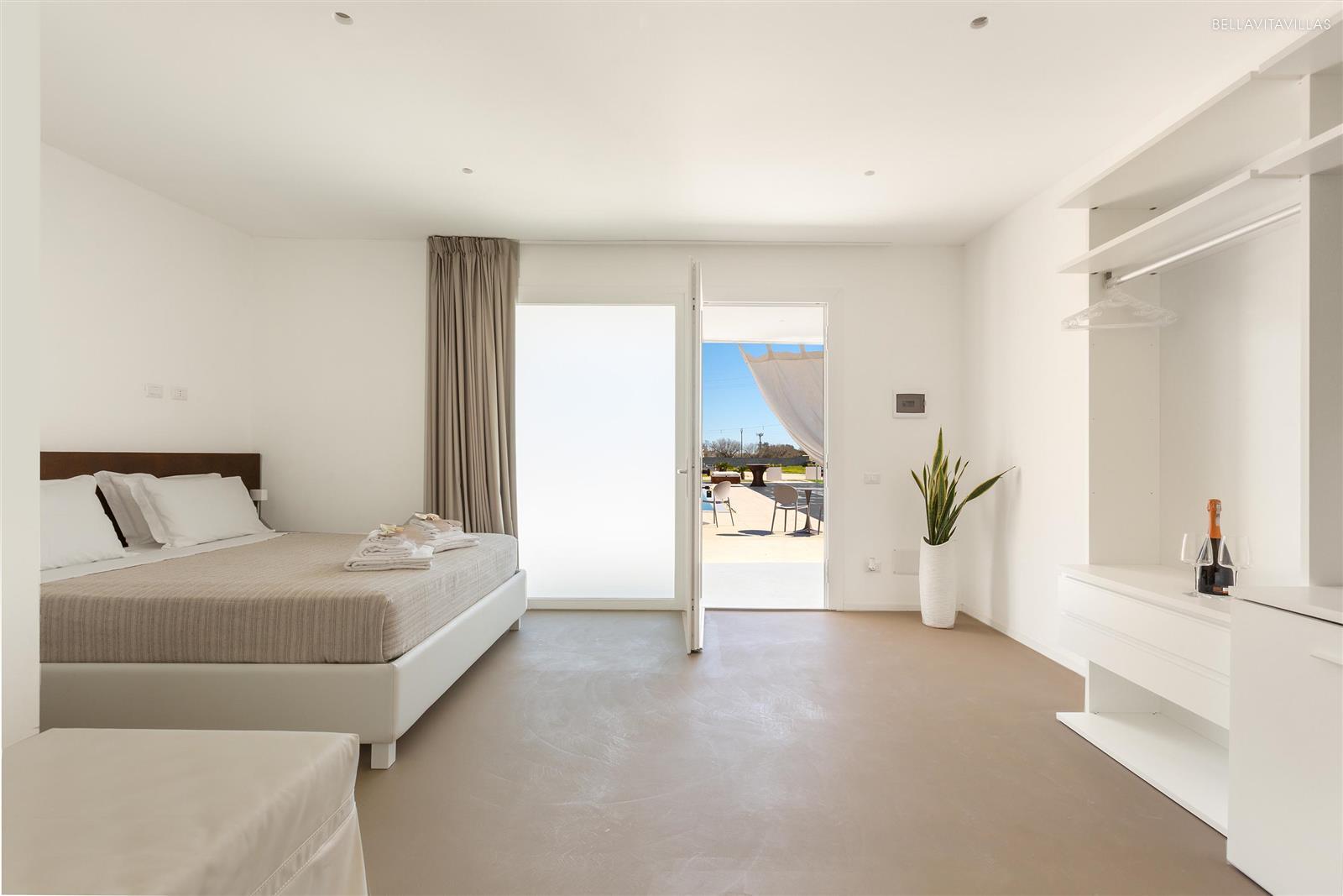Just outside the room is an outdoor space for exclusive use, furnished with a small table and chairs. Also included for guests is an umbrella and an oversize sunbed by the pool.