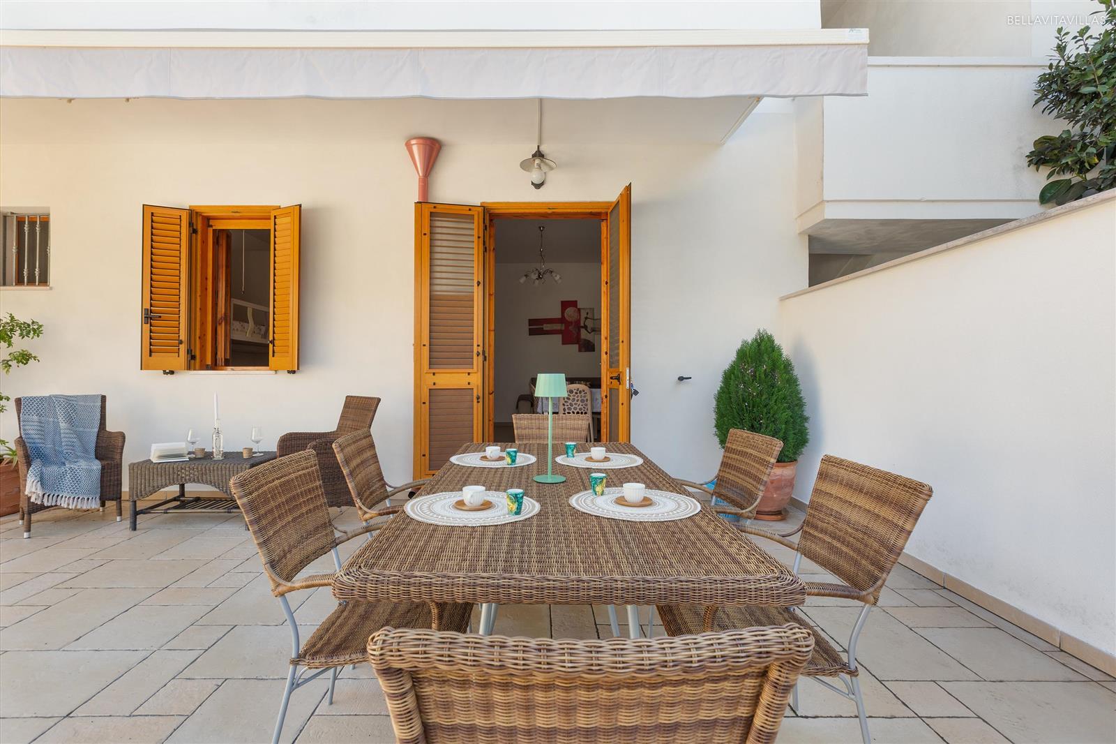 furnished veranda for relaxing, dining and outdoor dining, shaded by