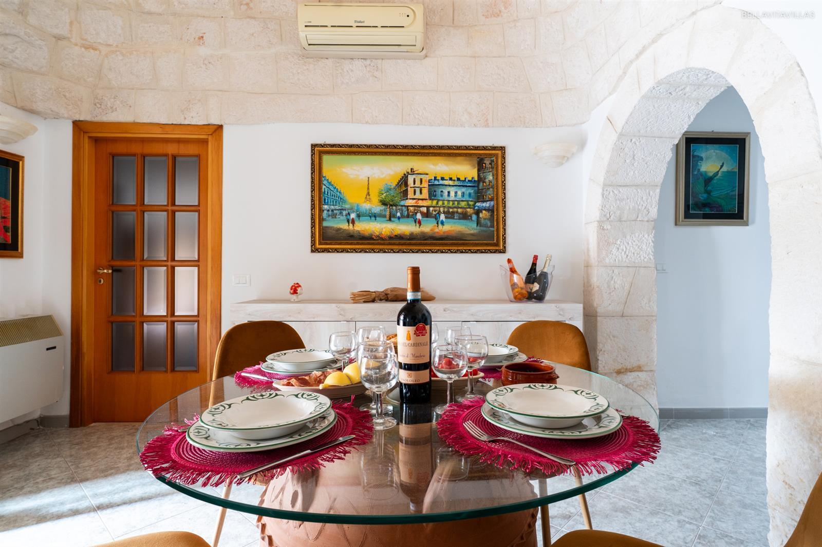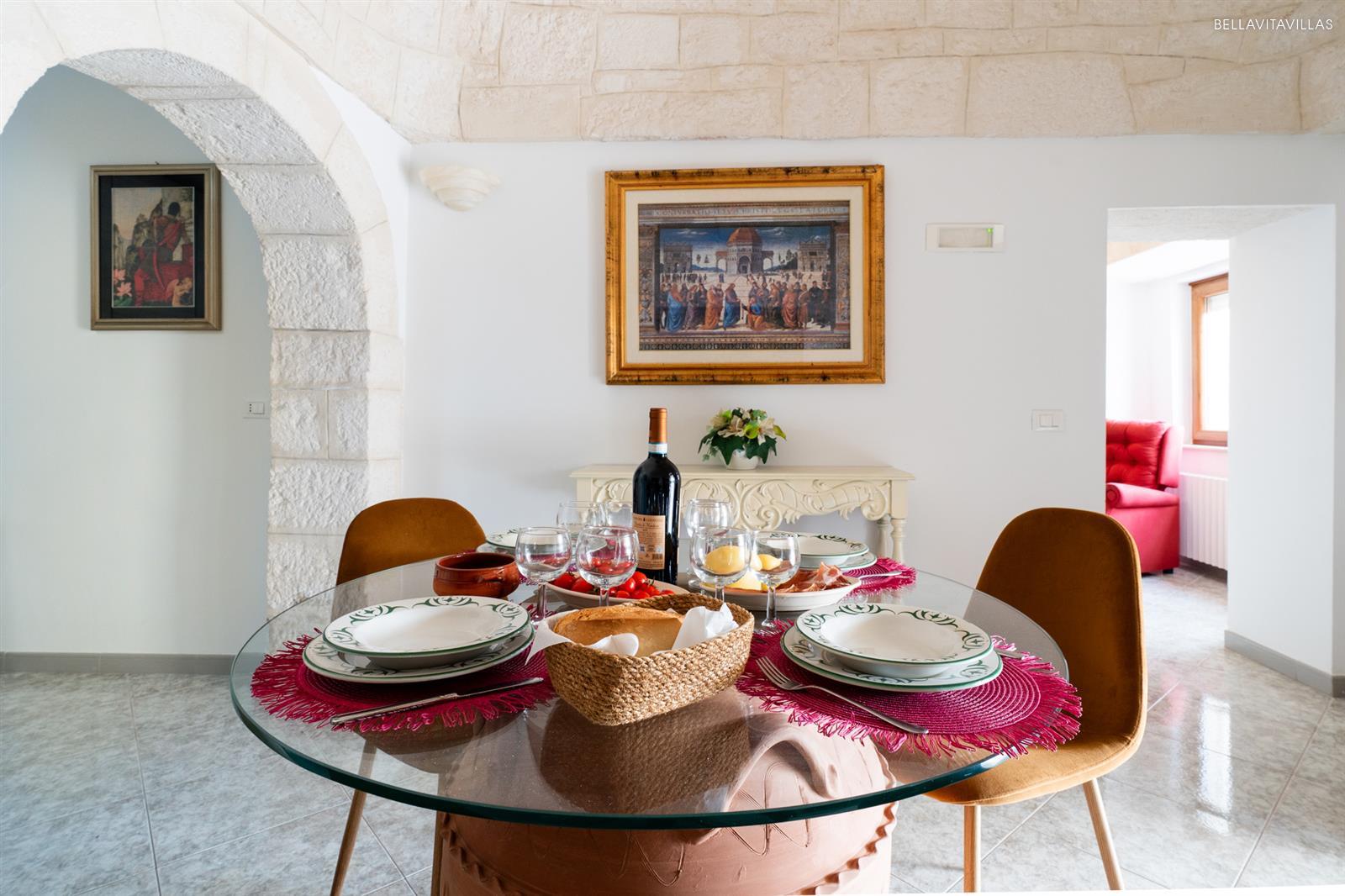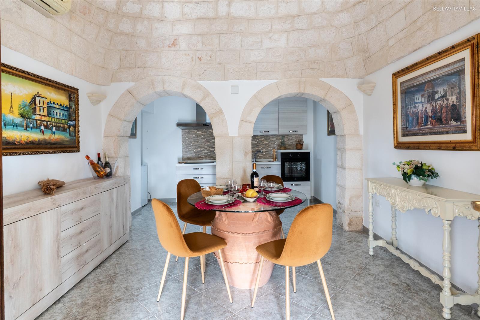 The first cone of the trulli is a beautiful living room with table and chairs for dining. Beyond two pretty stone arches is the well-equipped openkitchenette .