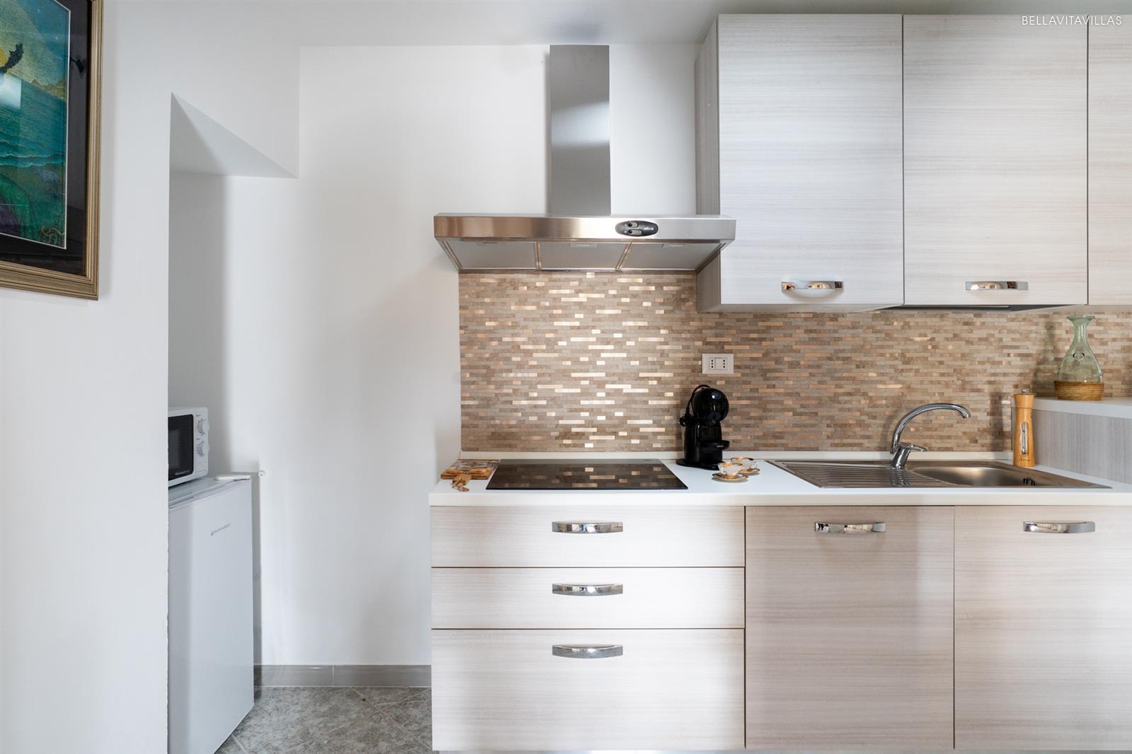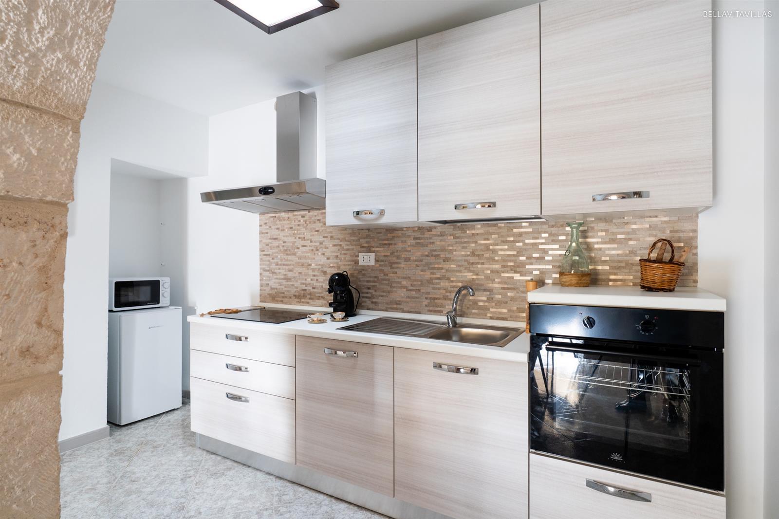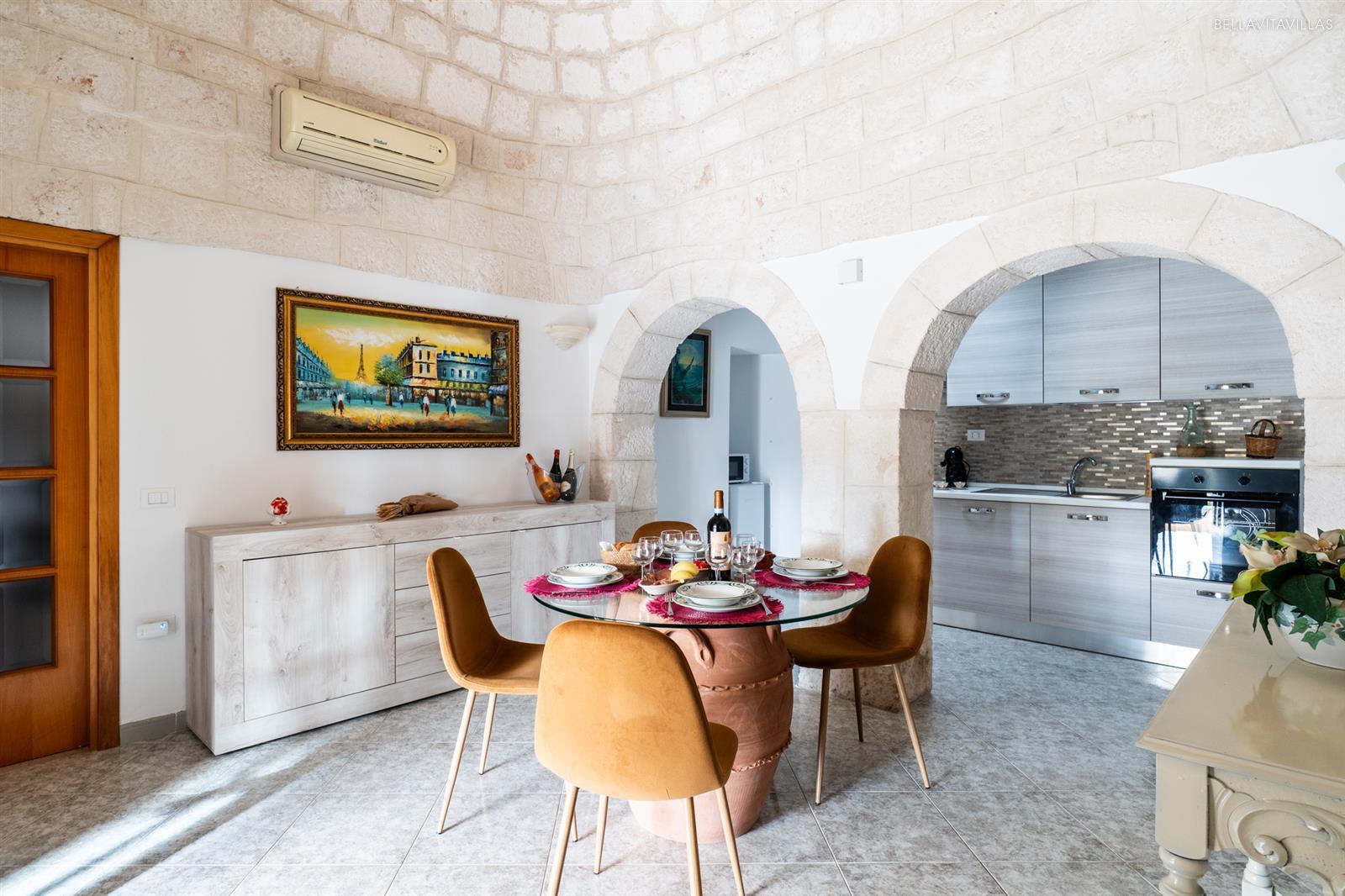 The first cone of the trulli is a beautiful living room with table and chairs for dining. Beyond two pretty stone arches is the well-equipped openkitchenette .