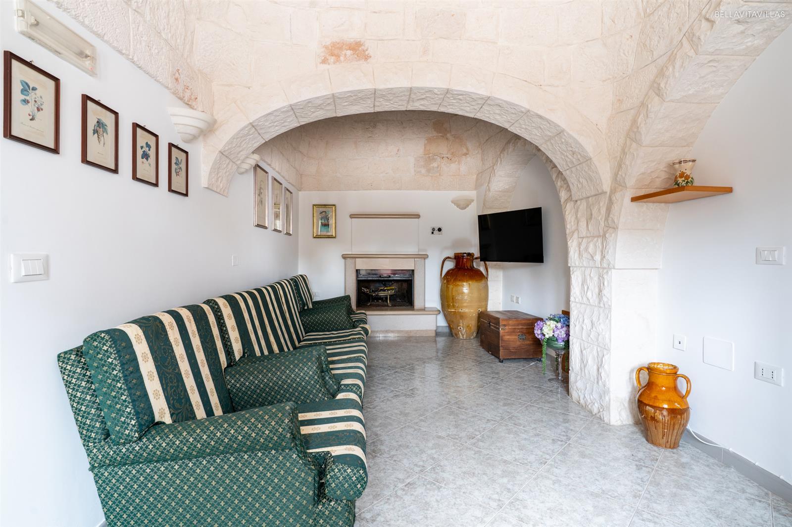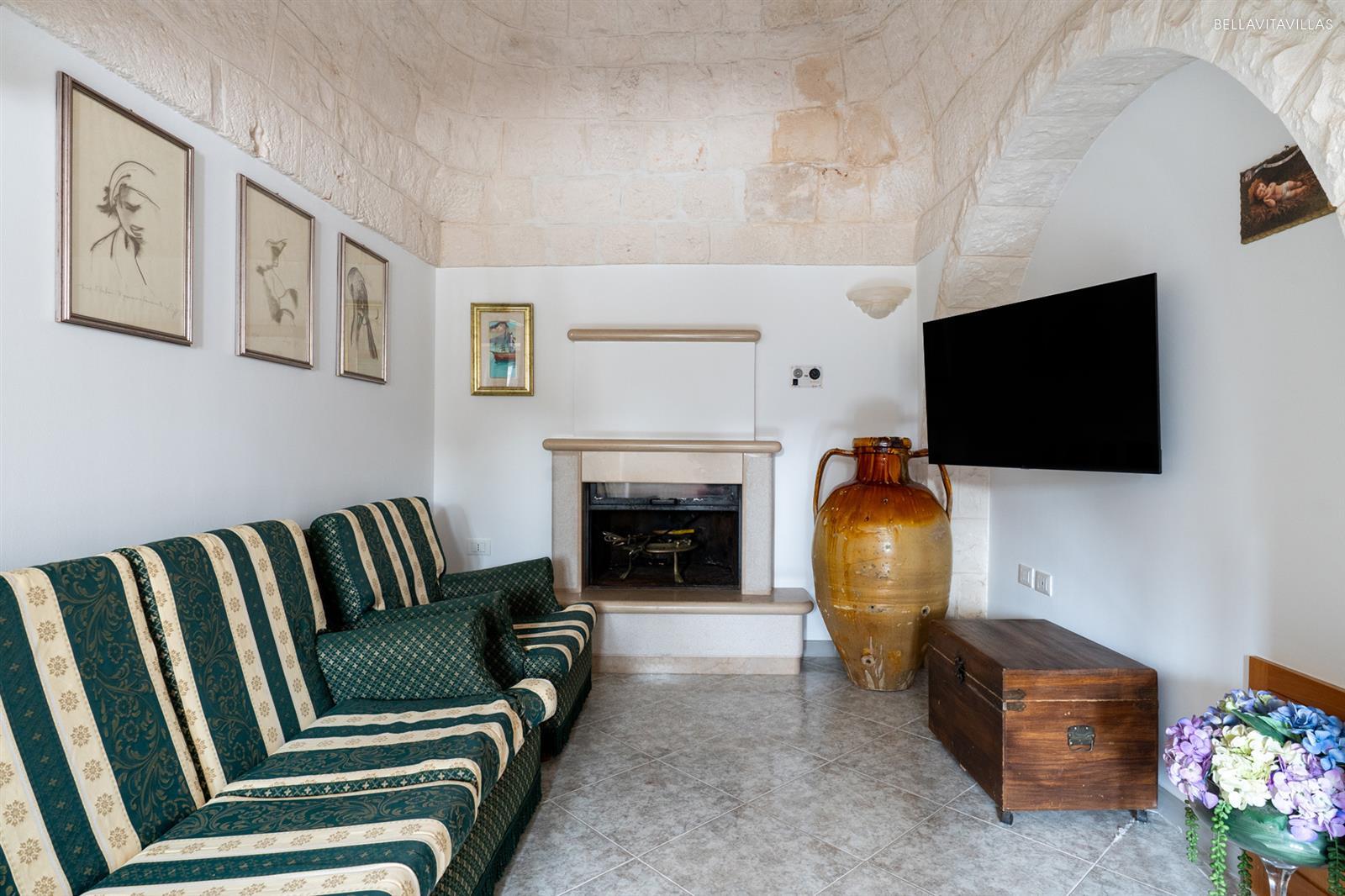 The second cone of the trulli houses the living room with sofa, armchairs, fireplace and TV.